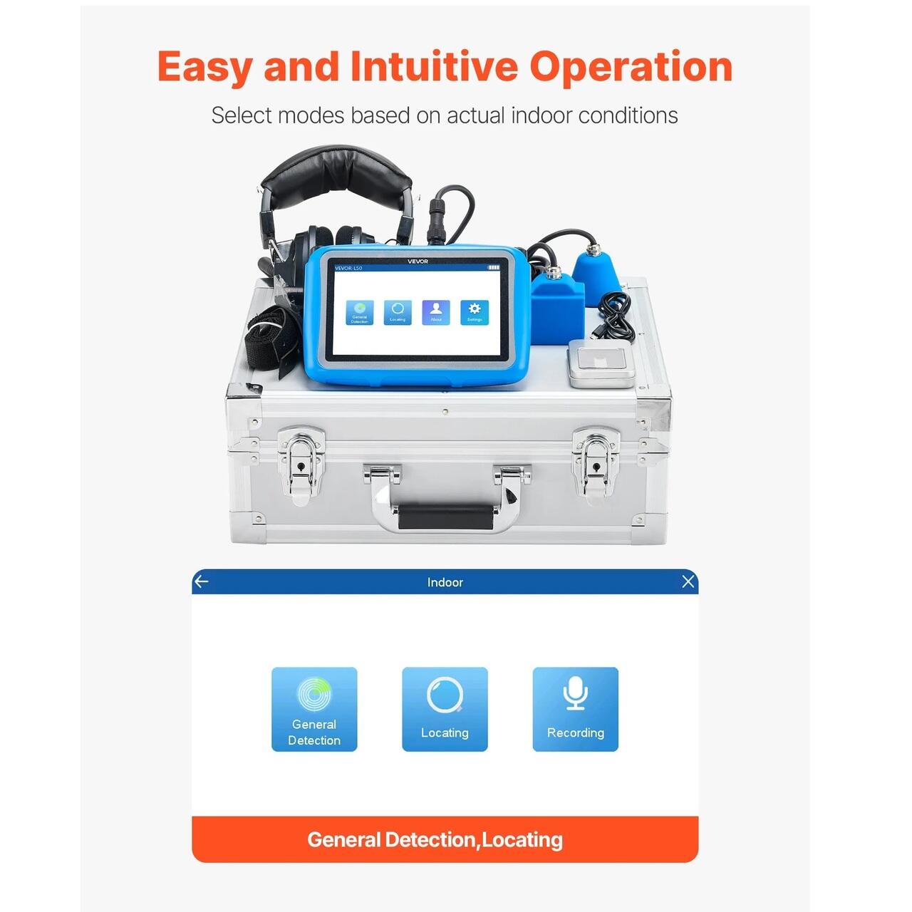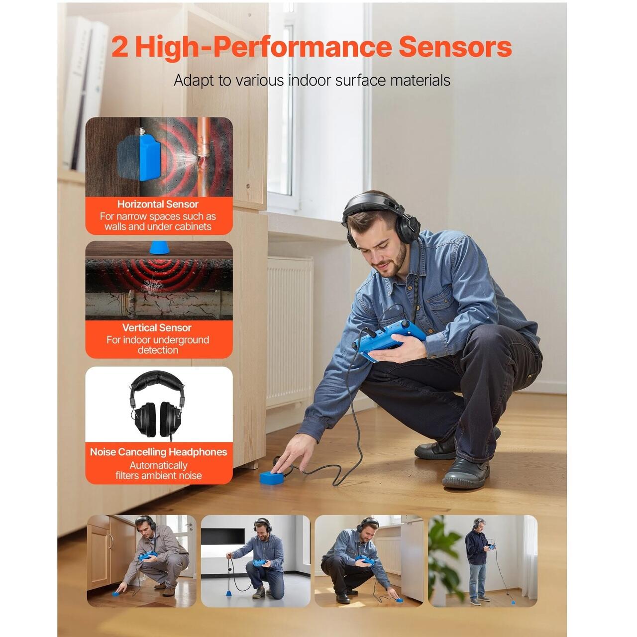 2 senzori sensibili pentru interior: Folositi senzorul orizontal in spatii inguste, cum ar fi peretii si sub dulapuri, senzorul vertical pentru majoritatea mediilor interioare, cum ar fi podeaua, si castile cu anulare a zgomotului pentru a filtra zgomotul ambiental si a realiza o detectare mai precisa a scurgerilor.
