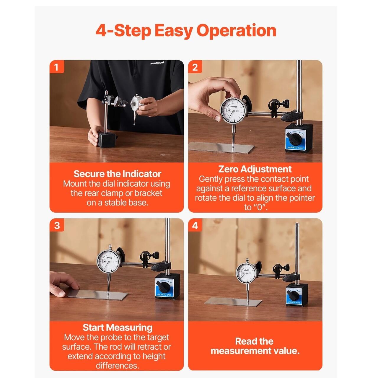 Instalare usoara: Cu o baza magnetica, comparatorul cu cadran pentru mecanic poate fi montat rapid, adus la zero si utilizat pentru masurare. Conceput atat pentru verificari de rutina, cat si pentru prelucrari complexe, acesta sustine fluxuri de lucru eficiente cu o operare usor de utilizat.