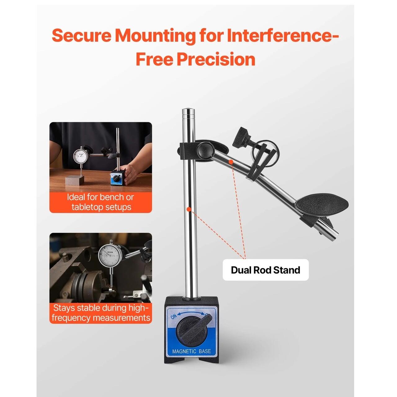 Suport stabil: Structura cu doua tije mentine indicatorul cu cadran stabil pe suprafetele de lucru. Ajuta la mentinerea pozitiei in timpul sesiunilor de masurare extinse, asigurand rezultate precise fara deplasari care ar putea afecta citirea.