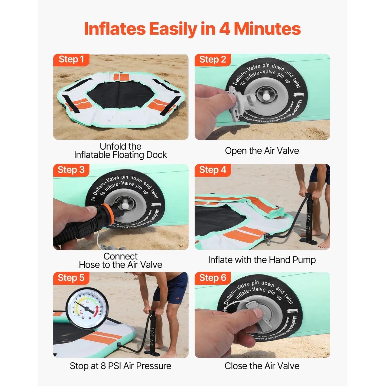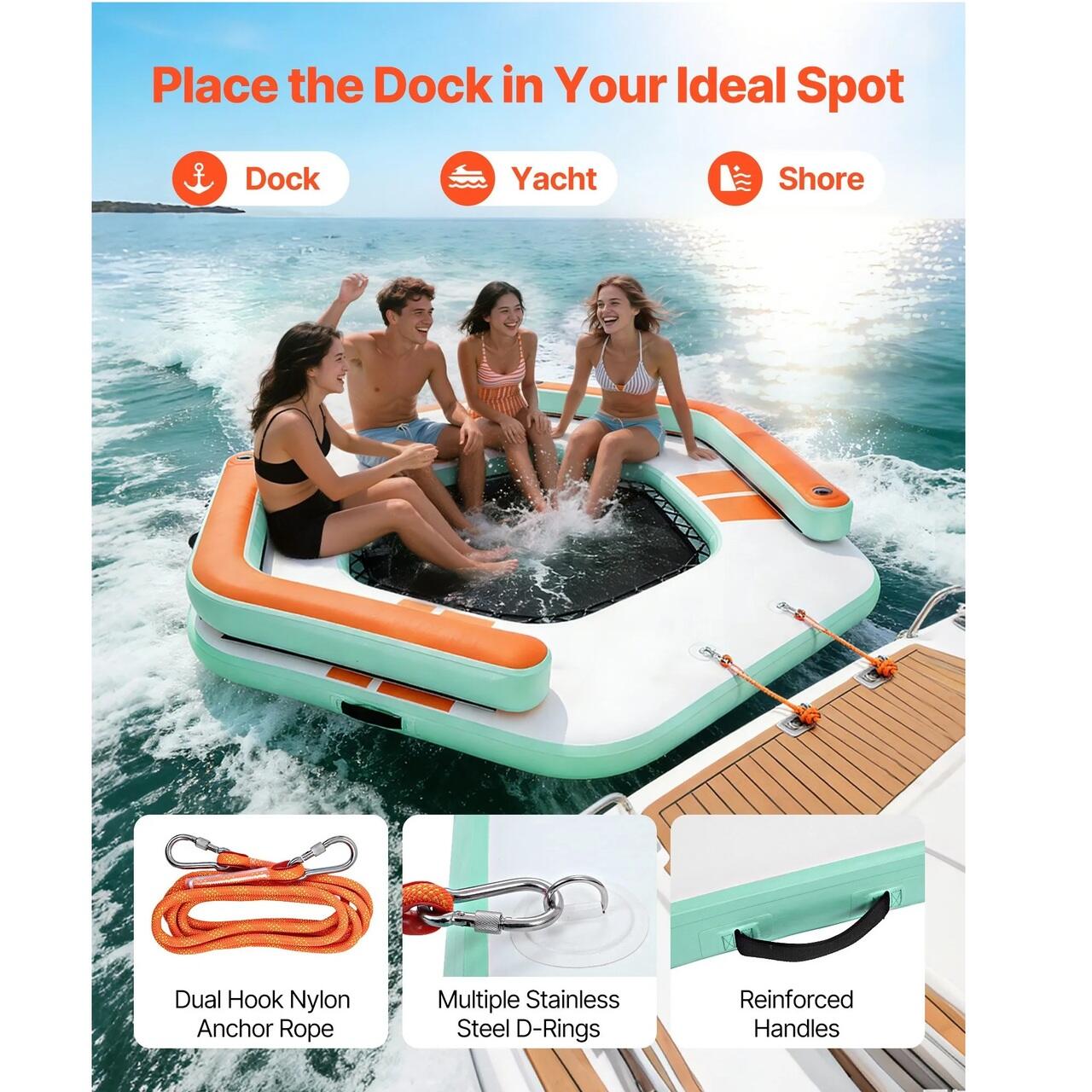 Optiuni usoare de ancorare: Proiectata cu mai multe inele D din otel inoxidabil si manere de transport pentru puncte de ancorare flexibile. Platforma noastra gonflabila de doc include o franghie de nailon de 3,05 m cu ancore cu carlig la ambele capete pentru o atasare convenabila la docuri, iahturi.