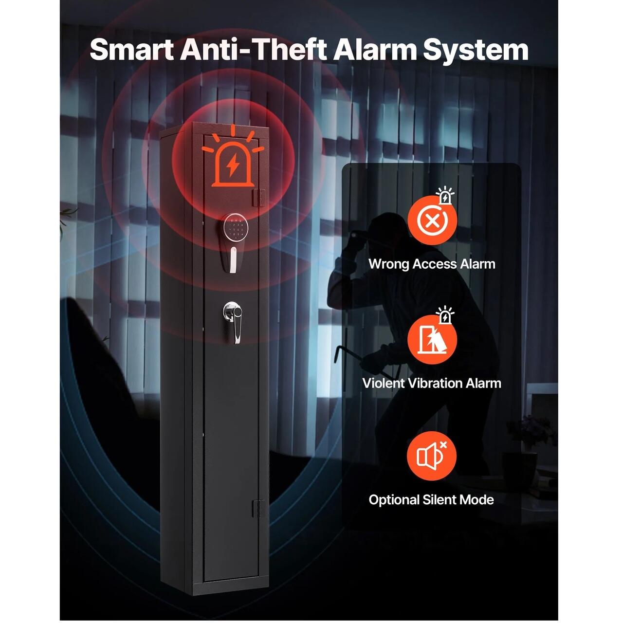 Sistem de alarma si mod silentios: Seiful pentru pusca declanseaza o alarma dupa 3 introduceri gresite ale codului PIN sau la detectarea impactului pentru protectie suplimentara. Introduceti 11# pentru a activa modul silentios, oferind acces discret si silentios pe timp de noapte sau in situatii sensibile.