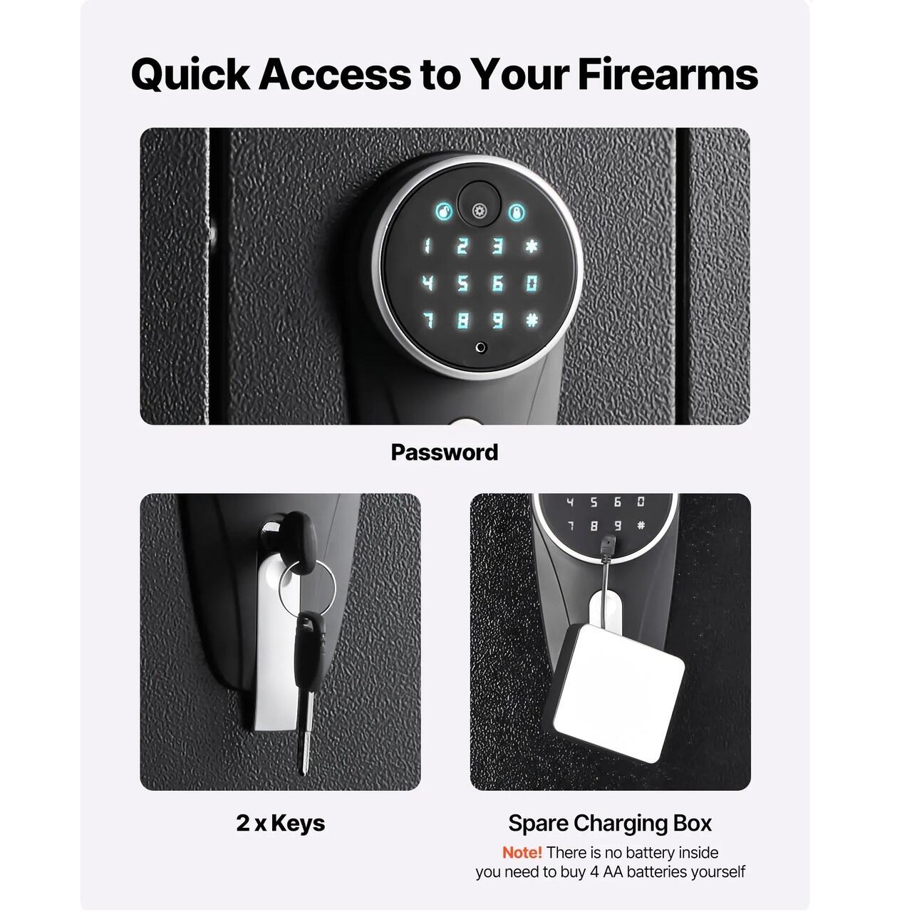 Smart Lock: Blocare PIN cu ecran tactil cu 9 cifre si acces rapid. Lungimea PIN-ului poate fi setata de utilizator intre 3 si 8 cifre; blocarea automata asigura seiful la inchidere. Include o cheie de urgenta si un port de incarcare extern, astfel incat sa puteti debloca dulapul pentru arme chiar daca bateria este descarcata.