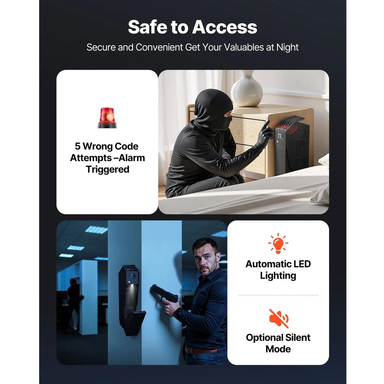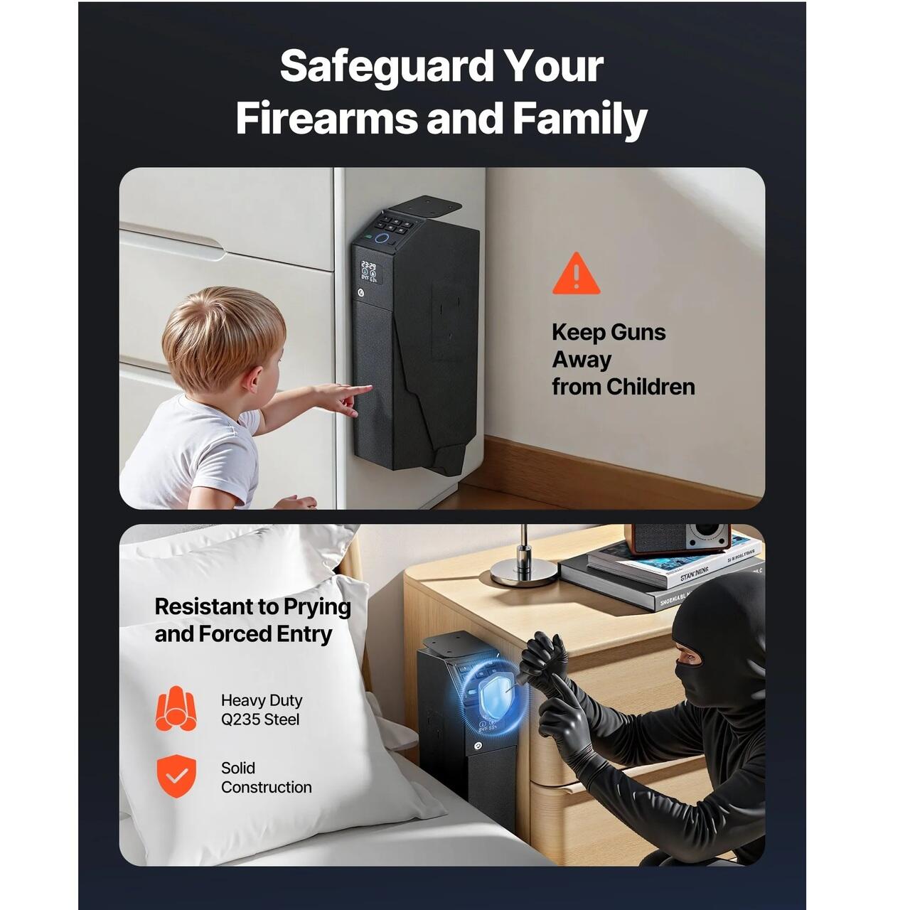 Instalare usoara: Acest seif pentru pistol este dotat cu o placa de montare pre-gaurita si 3 optiuni de instalare - stanga, dreapta sau sus. Designul sau compact se potriveste pe birouri, rafturi de carti sau noptiere pentru acces rapid si convenabil acasa, la birou sau la firma.