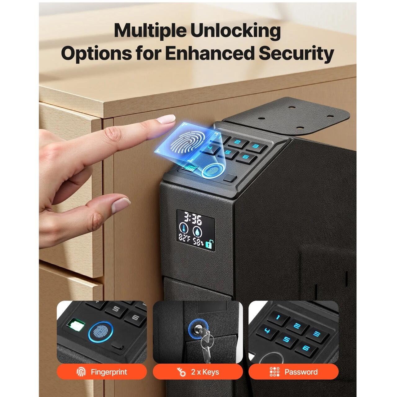 3 metode de acces: Acest seif pentru arme de mana are 3 optiuni de deblocare - stocheaza pana la 30 de amprente digitale sau un cod de 6 cifre pentru a bloca accesul neautorizat. Include 2 chei de rezerva si un port USB de urgenta pentru acces rapid chiar daca bateriile se descarca.