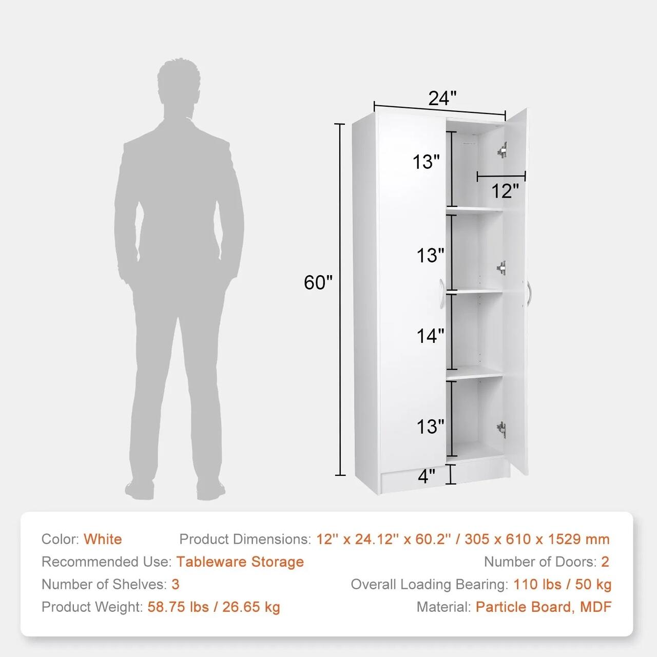 Dulap de camara super mare: Cu o capacitate totala de 50 kg si un spatiu de depozitare spatios de 30 x 61 x 152 cm, impreuna cu 2 usi si 3 rafturi, dulapul de camara de bucatarie VEVOR ofera spatiu amplu pentru a depozita o varietate de articole de masa, de la farfurii si boluri la ustensile si multe altele.