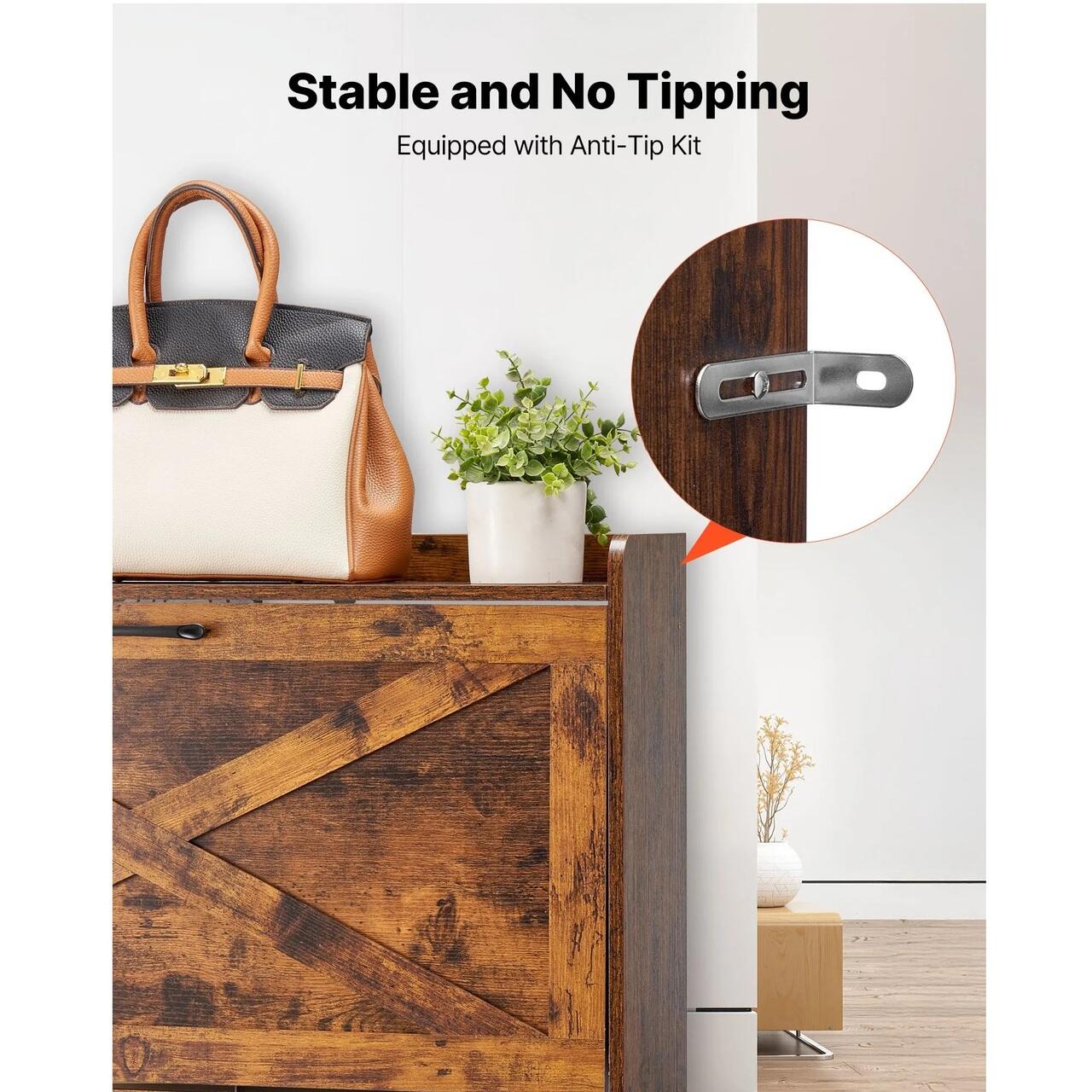 Stabil si robust: Un dispozitiv anti-rasturnare fixeaza dulapul de pantofi pe perete, reducand riscul de rasturnare. Fabricat din PAL pentru rezistenta si durabilitate. Suprafata superioara poate suporta pana la 15 kg, potrivita pentru decoratiuni sau cosuri de depozitare.