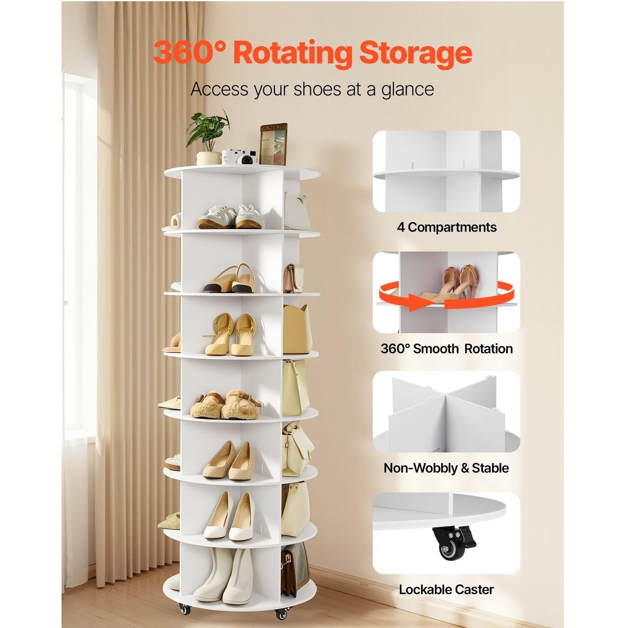 Roti rotative mobile: Suportul rotativ pentru incaltaminte are roti mobile si se poate roti la 360°. Designul sau rotativ la 360° face ca prinderea pantofilor sa fie rapida si simpla, sustinand utilizarea zilnica frecventa. Cele 4 roti blocabile il pot tine intr-un singur loc.