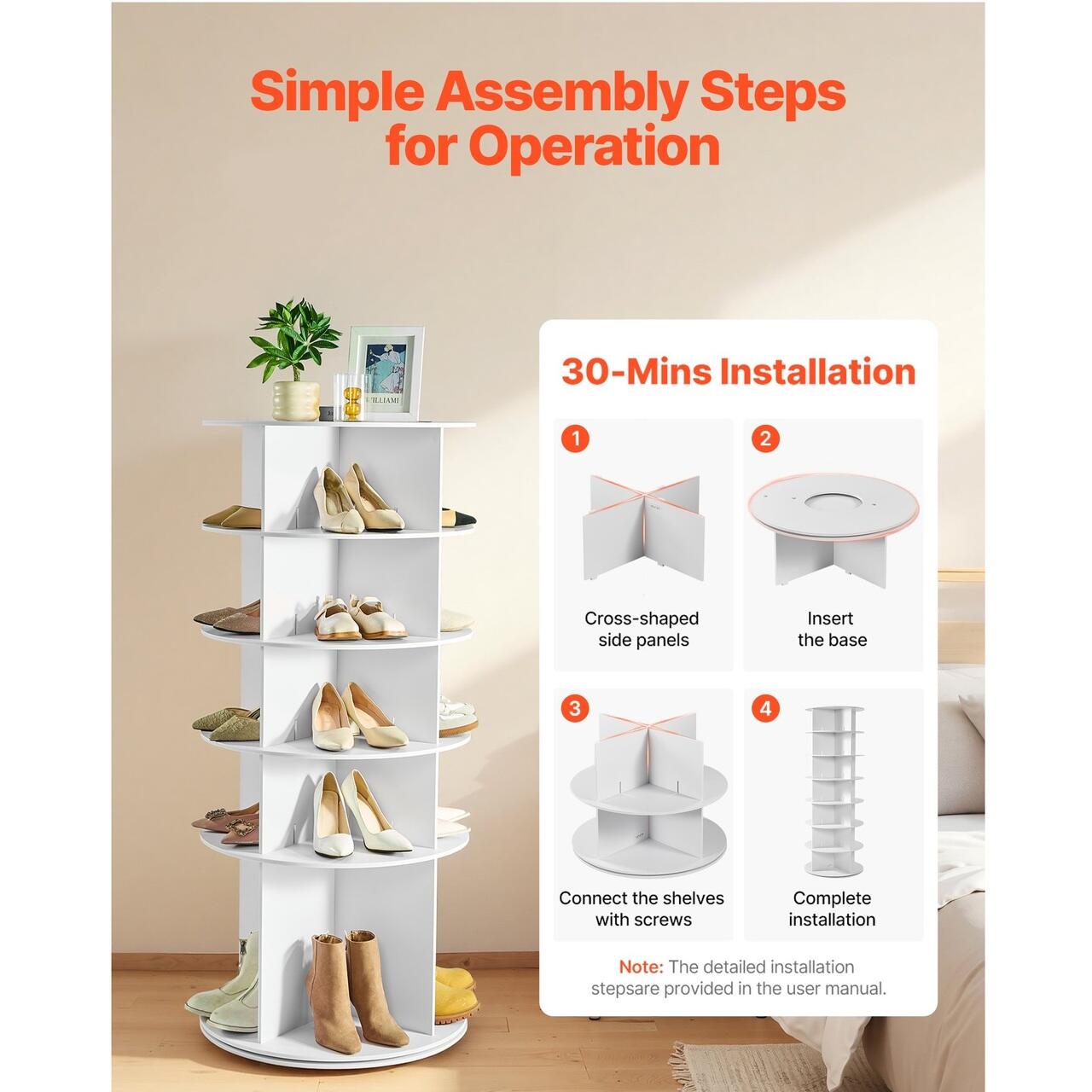 Asamblare usoara: Proiectat cu o structura de tip plug-in, suportul rotativ pentru incaltaminte include un manual ilustrat clar si accesorii complete. Nu necesita unelte profesionale - incepatorii il pot asambla cu usurinta.