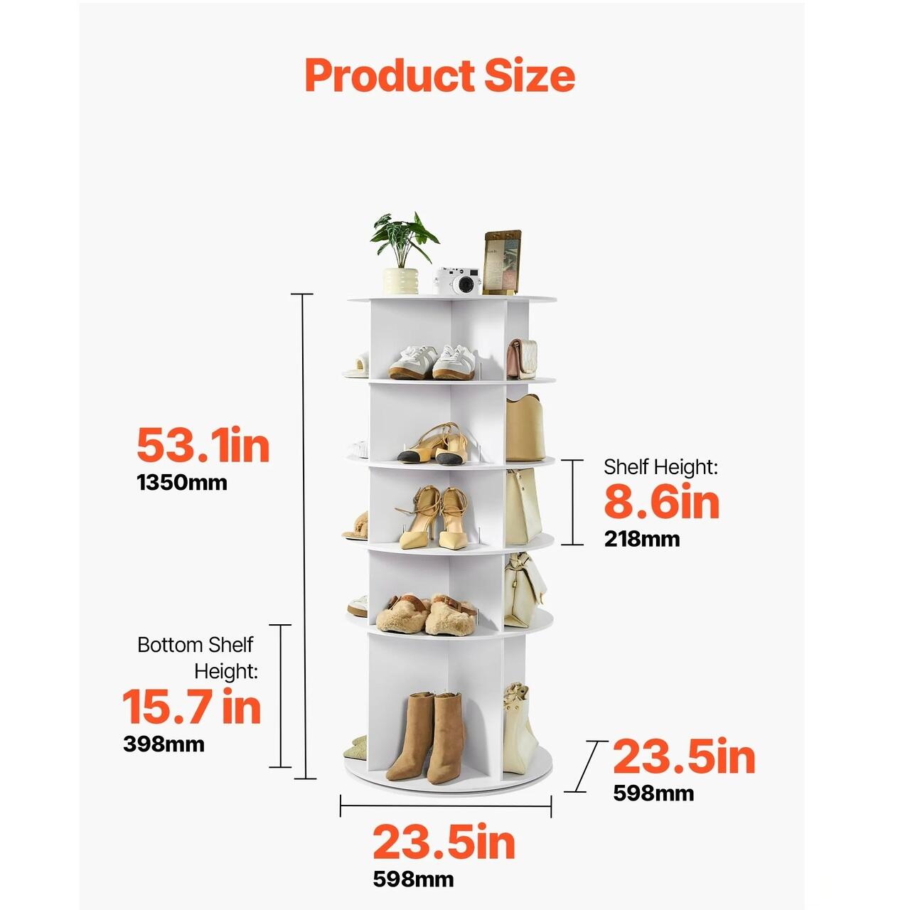 Design rotativ la 360°: Suportul rotativ pentru incaltaminte are o baza rotativa la 360° si 4 compartimente. Inaltimea interioara de 21 cm se potriveste diverselor tipuri de incaltaminte; nivelul inferior de 40 cm inaltime poate fi folosit pentru depozitarea cizmelor, rezolvand problemele de cautare si facilitand accesul rapid.