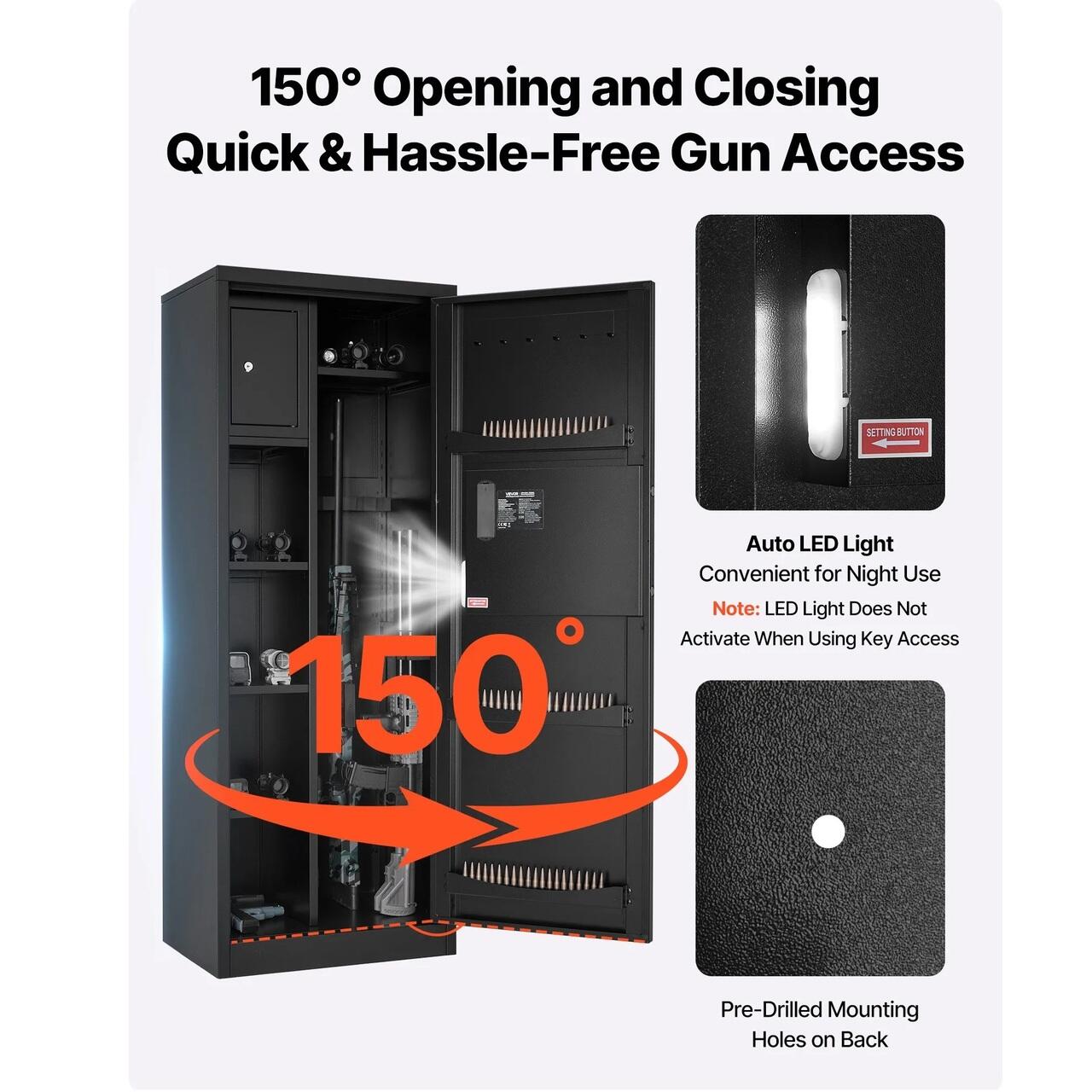 Acces rapid: Usa cu unghi larg de 150° se deschide complet pentru o vedere clara asupra tuturor armelor de foc, facilitand recuperarea rapida a acestora. In interior, este echipata cu lumini LED automate, asigurand vizibilitatea chiar si in conditii de lumina slaba.