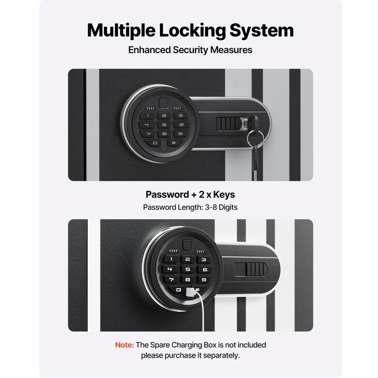 Smart Lock: Blocarea cu parola a ecranului tactil cu 9 cifre ofera acces rapid. Parola poate fi setata intre 3 si 8 cifre, cu o functie de blocare automata pentru securitate sporita. De asemenea, include o cheie de urgenta si o cutie de incarcare de rezerva pentru deblocare usoara in timpul descarcarii bateriei. (Nota: Nu exista baterie in interior, trebuie sa cumparati 4 baterii AA separat.)