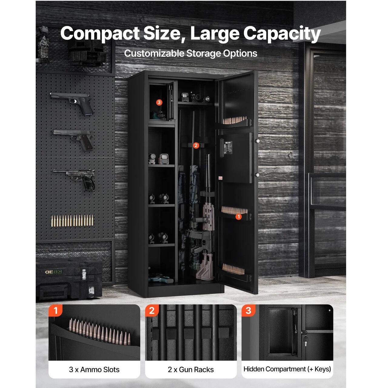 Seif de mare capacitate: Acest seif pentru arme poate tine pana la 4 pusti, cu 3 sloturi pentru munitie si 2 suporturi reglabile pentru arme. De asemenea, dispune de un compartiment ascuns (cu o cheie separata) pentru depozitarea accesoriilor pentru arme de foc, a munitiei sau a altor obiecte de valoare.