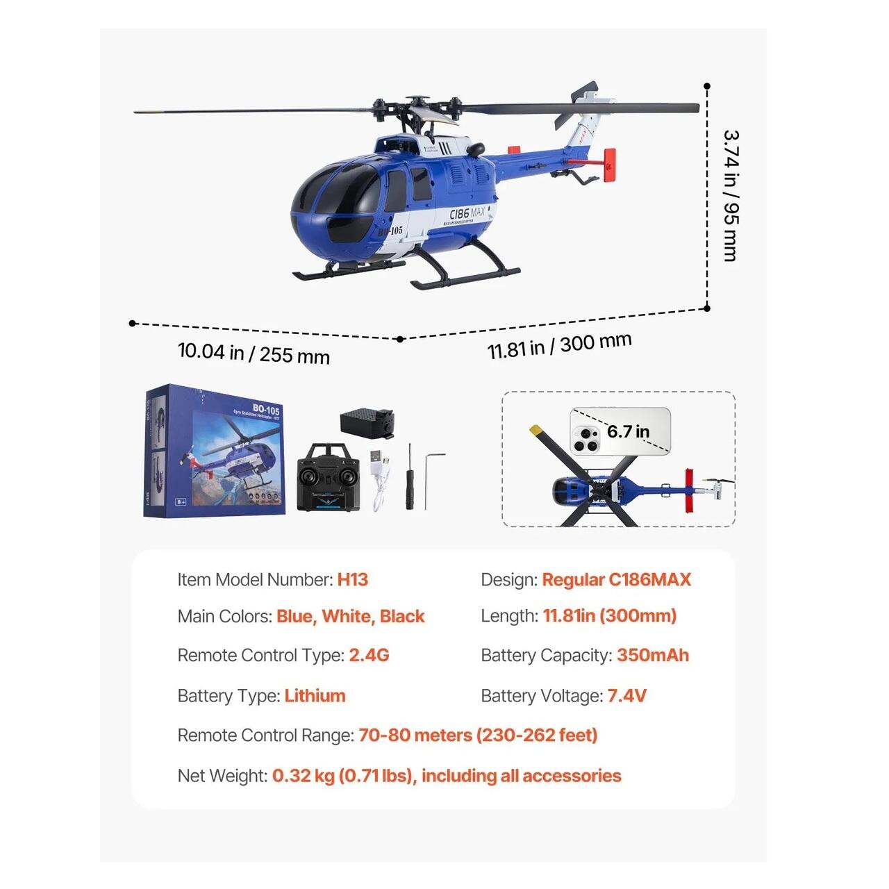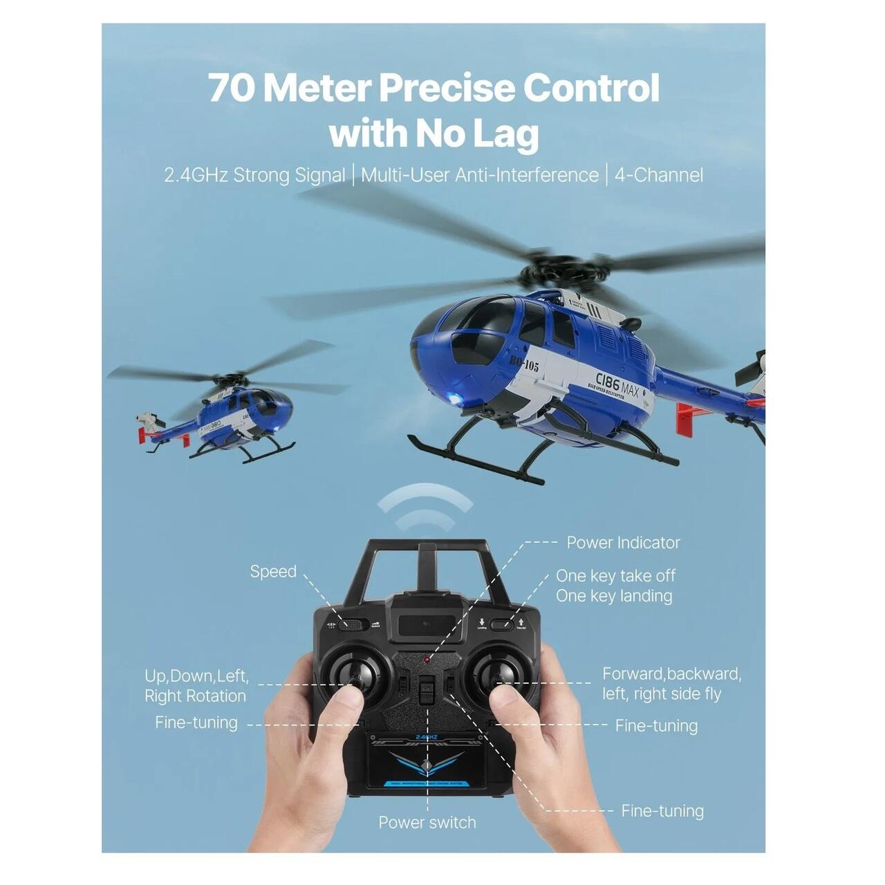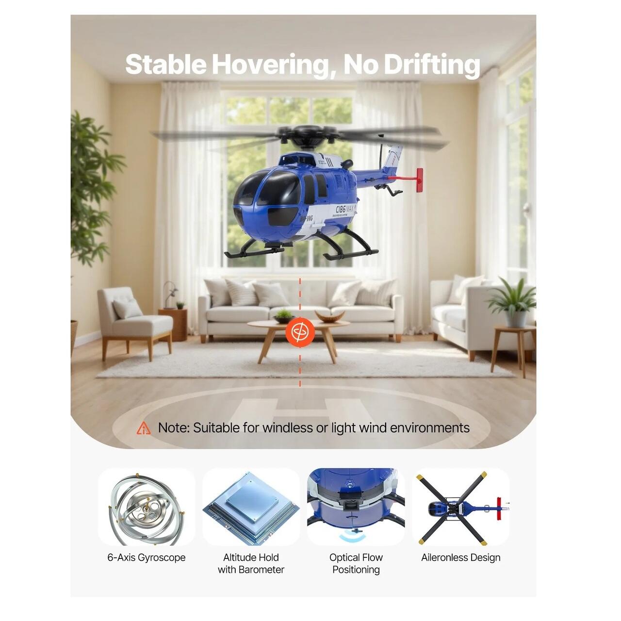 Usor de stapanit: Elicopterul RC dispune de o singura tasta pentru decolare si aterizare, ceea ce simplifica zborul chiar si pentru incepatori. Cu functii suplimentare precum zborul lateral, planarea si zborul pe ruta, acesta deschide o gama mai larga de optiuni distractive de zbor.