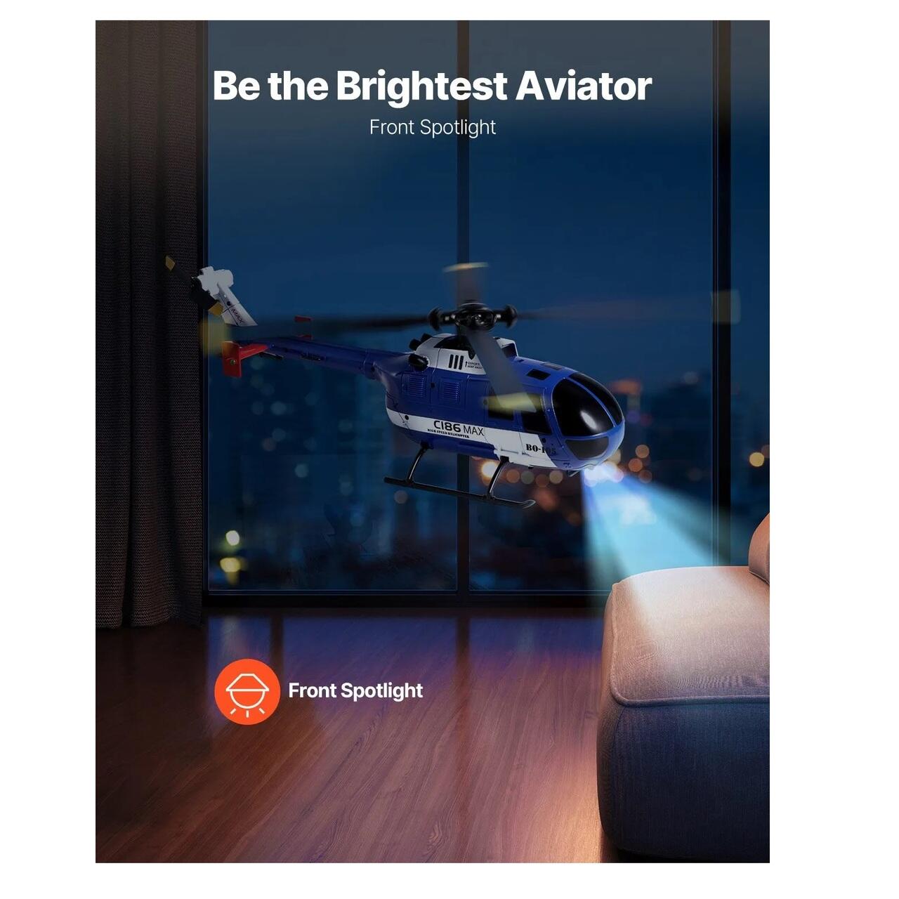 Zbor nocturn distractiv: Echipat cu un reflector, elicopterul cu telecomanda straluceste puternic in intuneric, sporind siguranta si distractia. Lumina din spate actioneaza si ca avertizare, asigurand zborul in siguranta atunci cand bateria este descarcata.