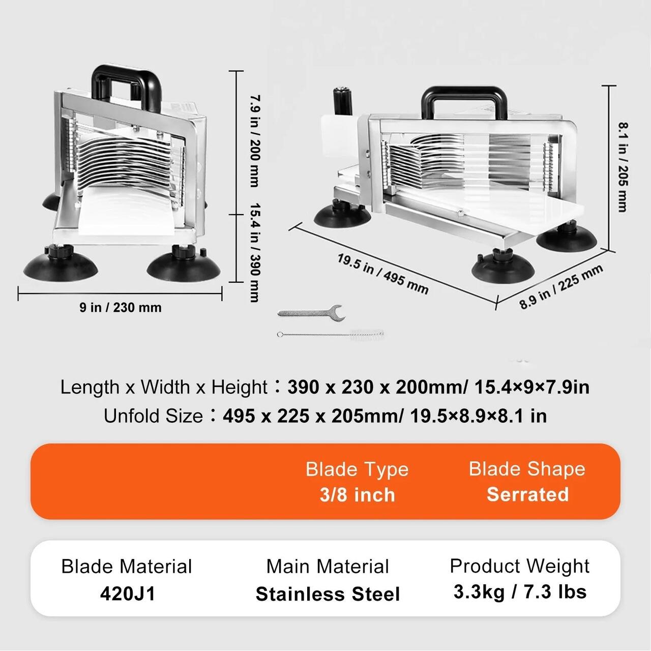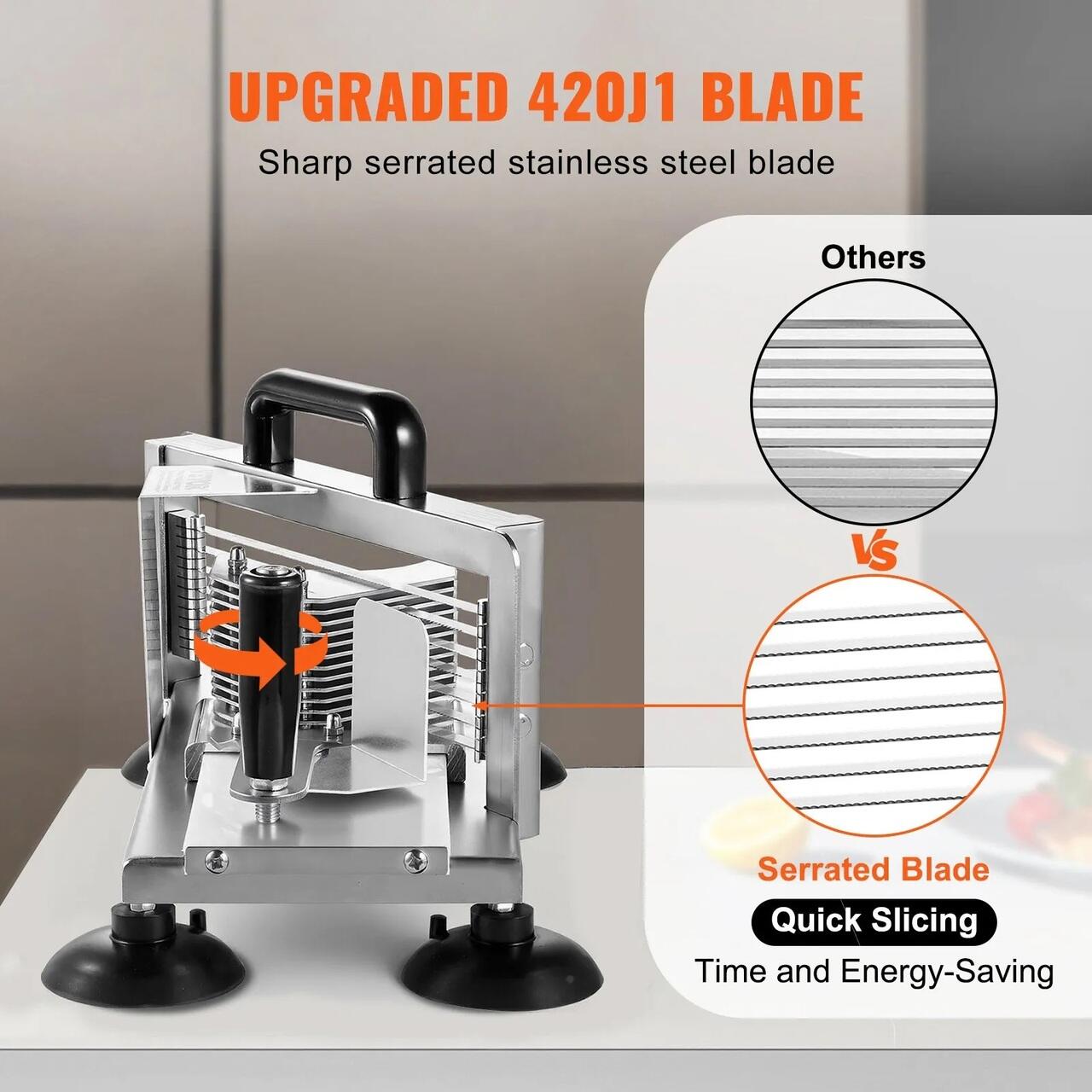 Feliere eficienta si uniforma: Feliatorul de rosii este echipat cu lame ascutite din otel inoxidabil 420J1, cu muchii zimtate, care feliaza fara efort fructele si legumele in dimensiuni uniforme de 3/8 inch.