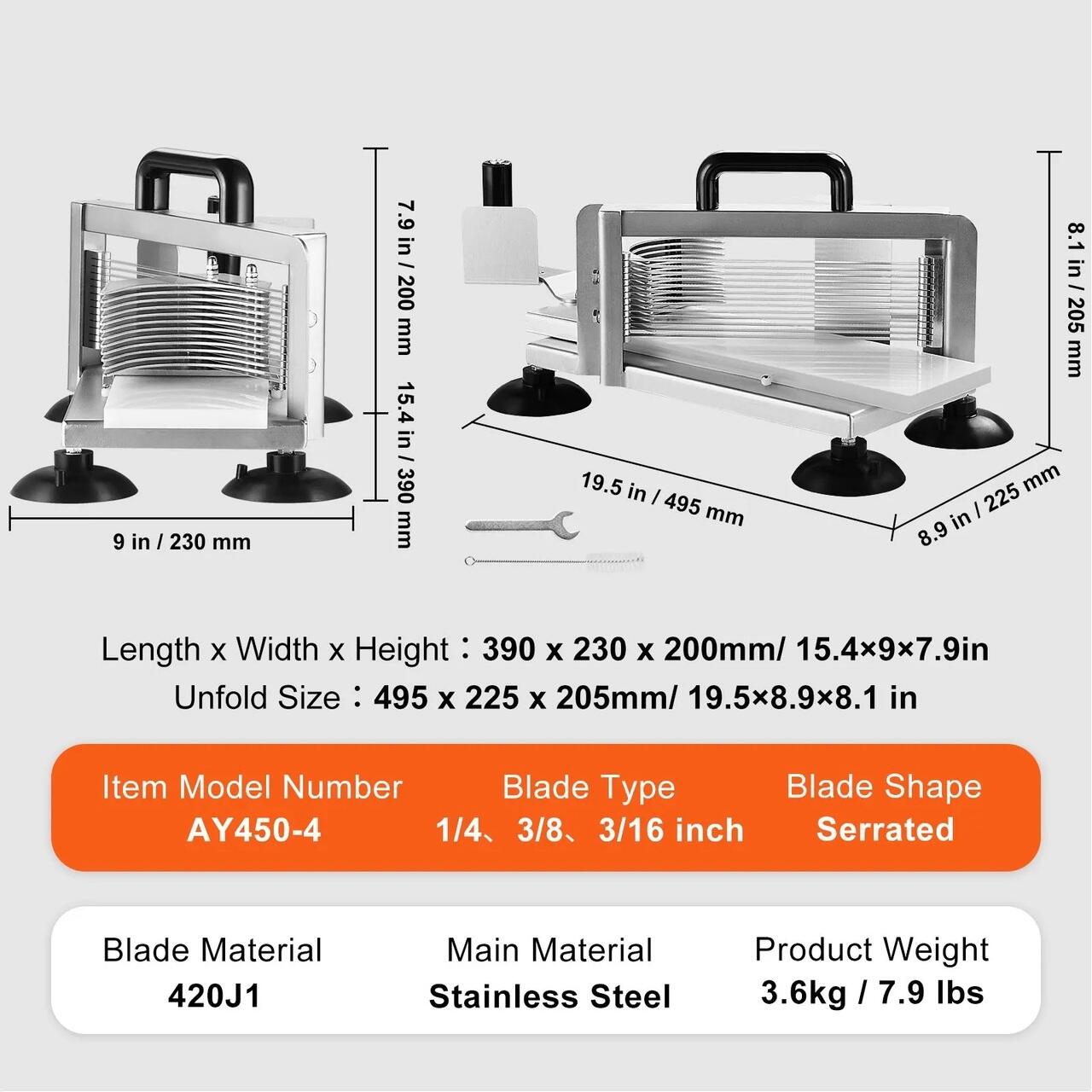 Feliere eficienta si uniforma: Feliatorul de rosii este echipat cu lame ascutite din otel inoxidabil 420J1, cu muchii zimtate, care feliaza fara efort fructele si legumele in dimensiuni uniforme de 1/4", 3/8", 3/16".