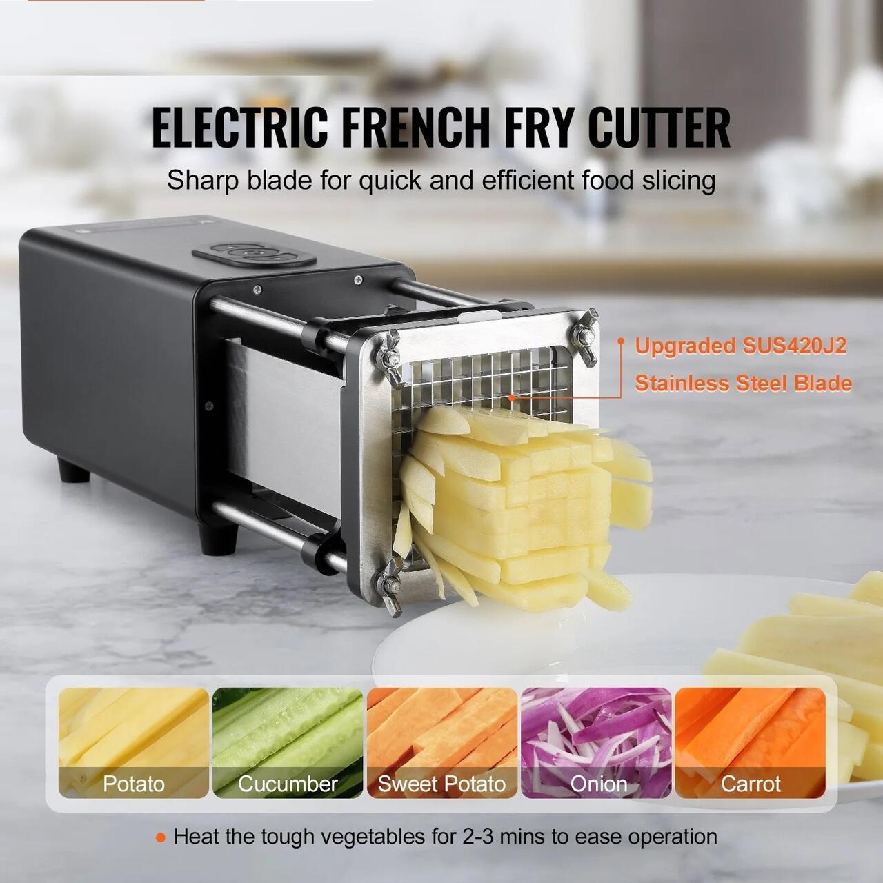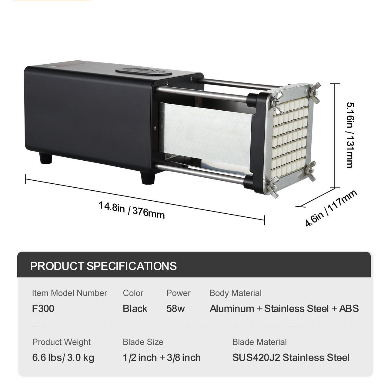Lame durabile: Cutitul nostru pentru cartofi prajiti utilizeaza lame imbunatatite din otel inoxidabil 420J2, de calitate alimentara, in dimensiuni de 1/2 inch si 3/8 inch, permitand taierea fara efort a legumelor precum cartofi, morcovi, castraveti si chiar a legumelor mai tari, cum ar fi cartofii dulci.