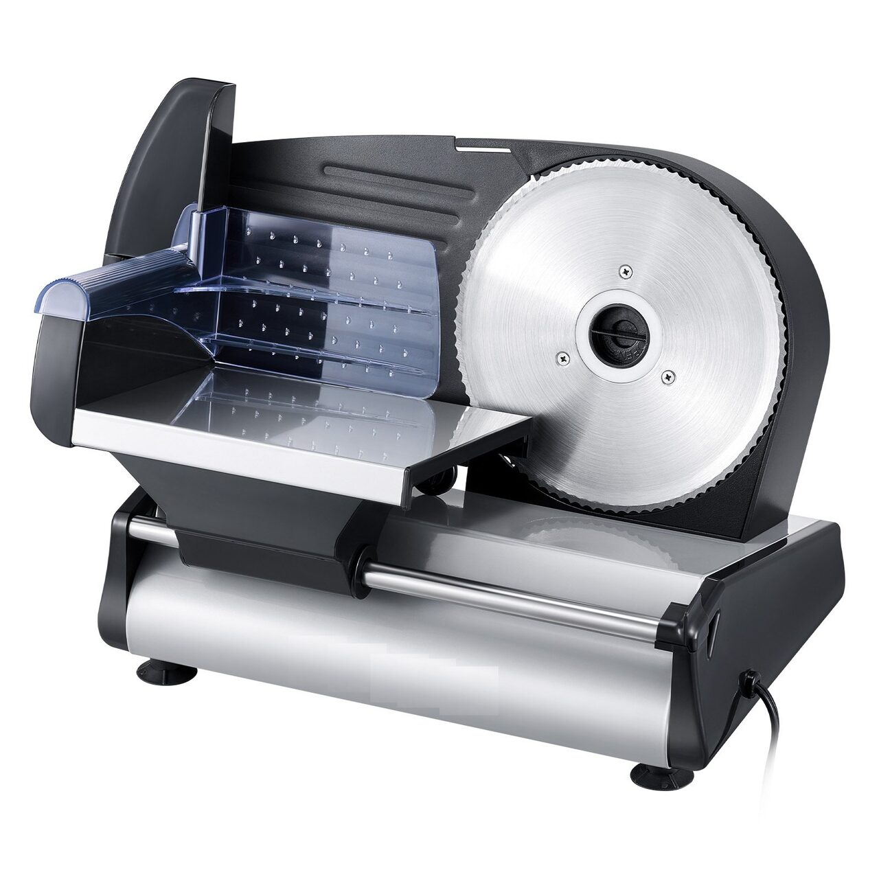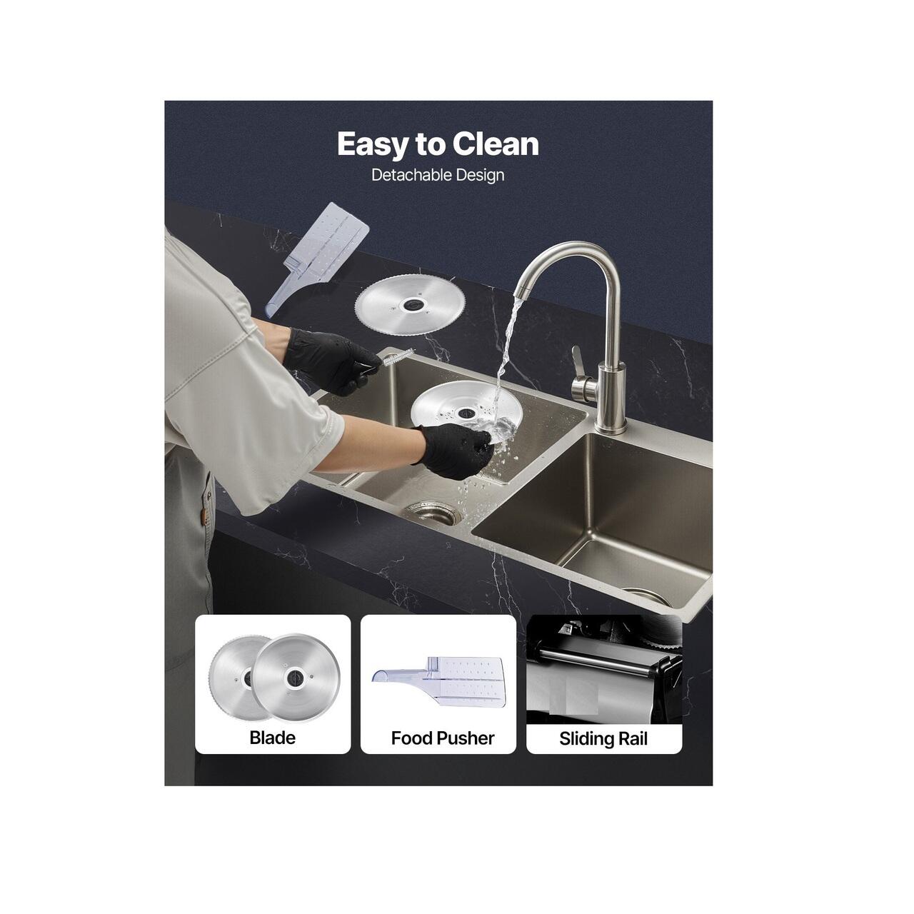Demontare pentru curatare usoara: Fabricata din materiale de calitate alimentara pentru toate piesele care intra in contact cu alimentele, masina noastra de feliat carne este conceputa pentru confortul dumneavoastra. Dispune de o tava din otel inoxidabil usor de curatat. Lama, suportul pentru alimente si impingatorul de alimente sunt usor detasabile, ceea ce face ca curatarea post-utilizare sa fie floare la ureche si mentin bucataria dumneavoastra impecabila.