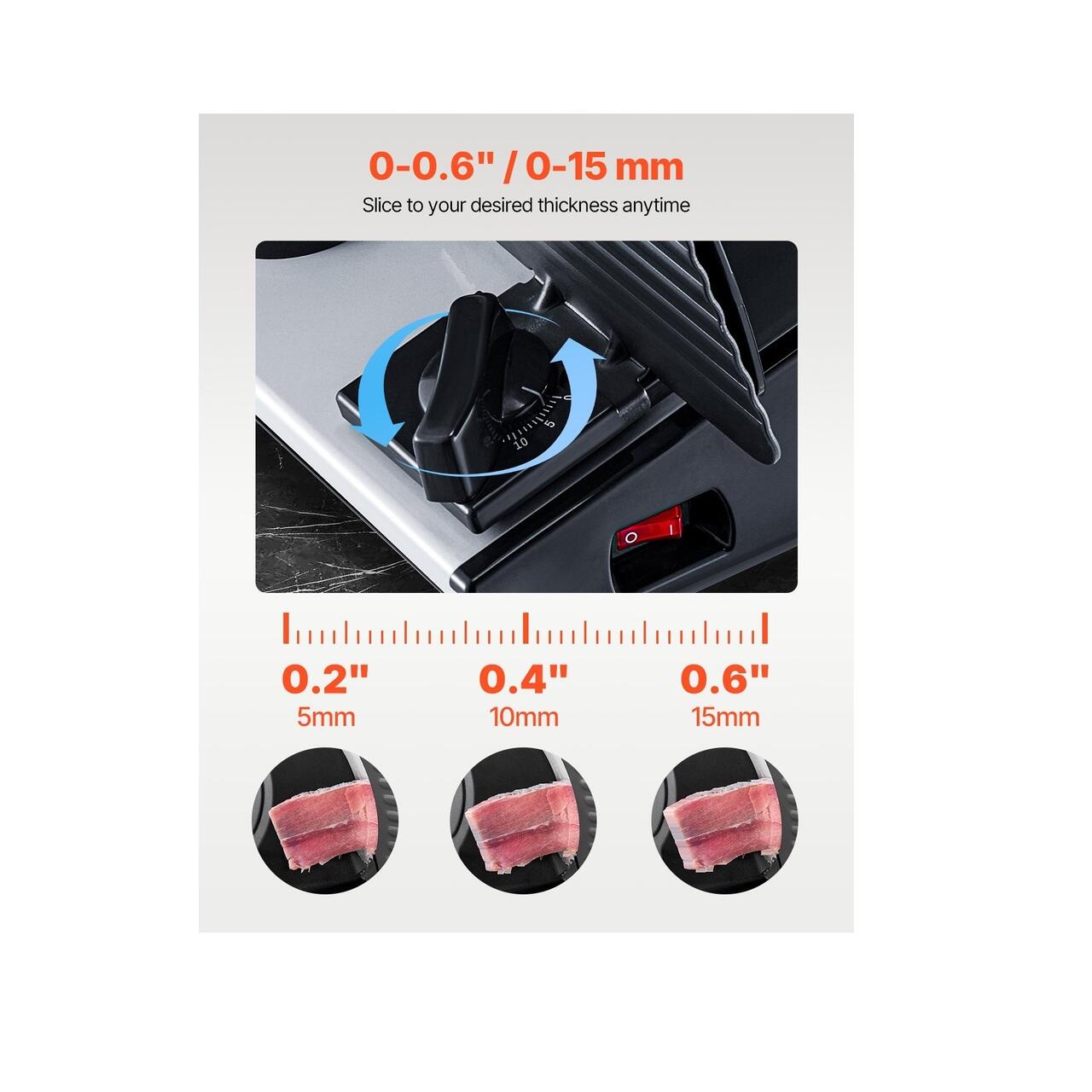 Grosime reglabila: Feliatorul de mezeluri dispune de un buton de reglare a grosimii cu un interval de la 0 la 15 mm. Puteti personaliza cu usurinta grosimea pentru a satisface nevoile dumneavoastra de preparare. Ideal pentru prepararea hamburgerilor, sandvisurilor, mezelurilor, platourilor cu fructe si multe altele.