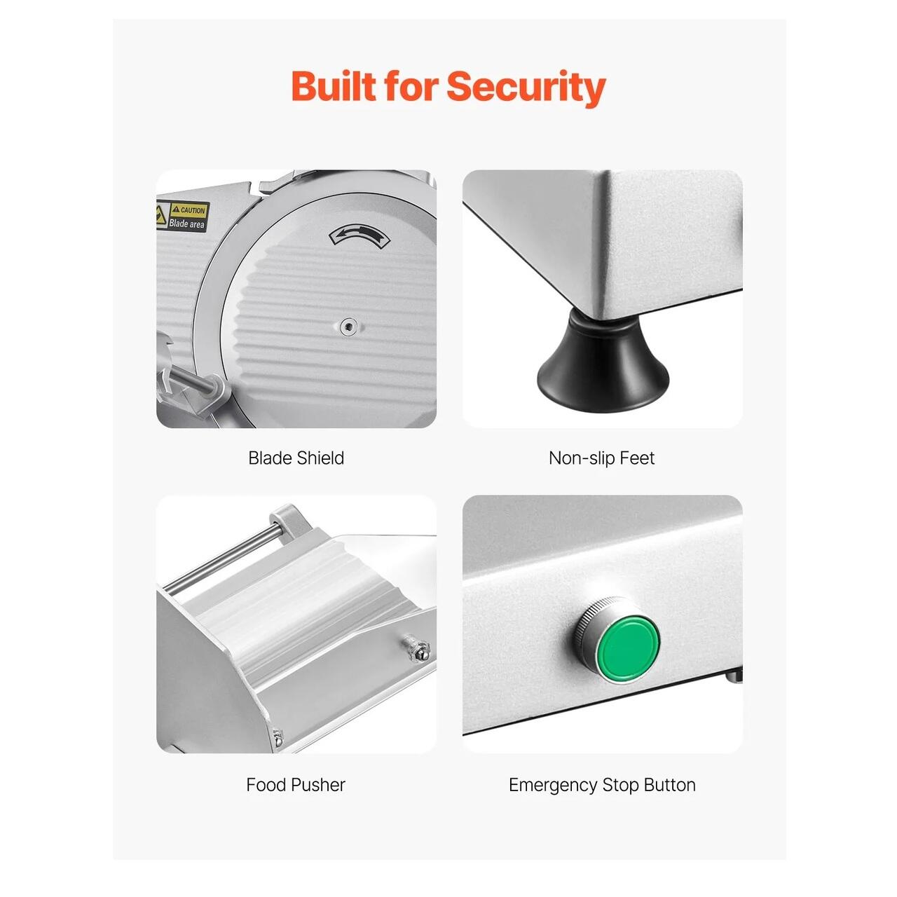 Stabil si sigur: Cu o protectie pentru lama, un impingator de alimente si picioare antiderapante, feliatorul nostru de mezeluri ofera o feliere stabila si lina a carnii, mentinandu-va in siguranta in timpul lucrului. Intre timp, impingatorul automat de alimente sporeste eficienta.