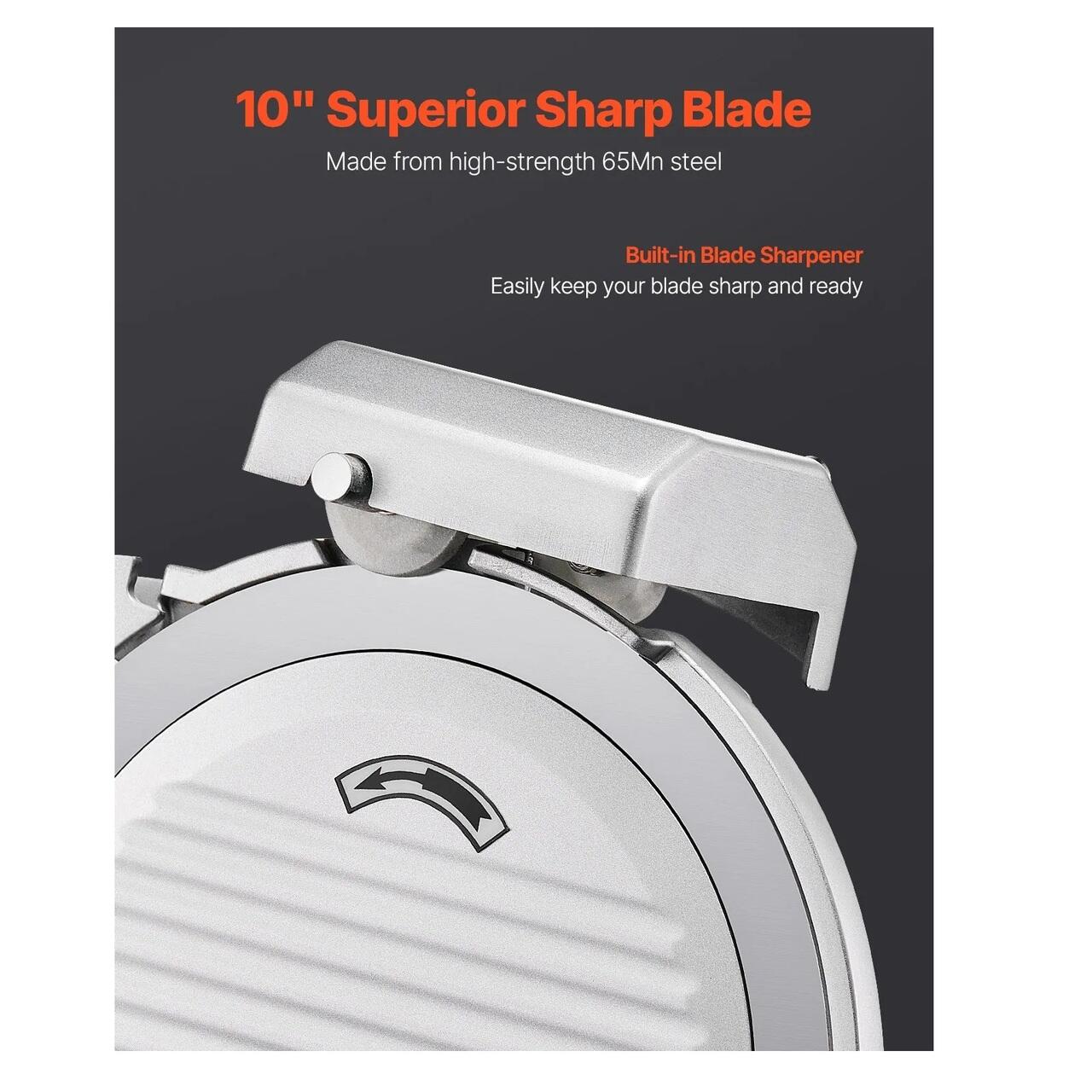 Lama imbunatatita de 25 cm: Feliatorul nostru de carne este echipat cu o lama imbunatatita, cu 25 cm mai lata, care poate taia fara efort diverse texturi alimentare, cum ar fi carne congelata, branza si paine. Il puteti mentine ascutit cu ajutorul ascutitorului incorporat.