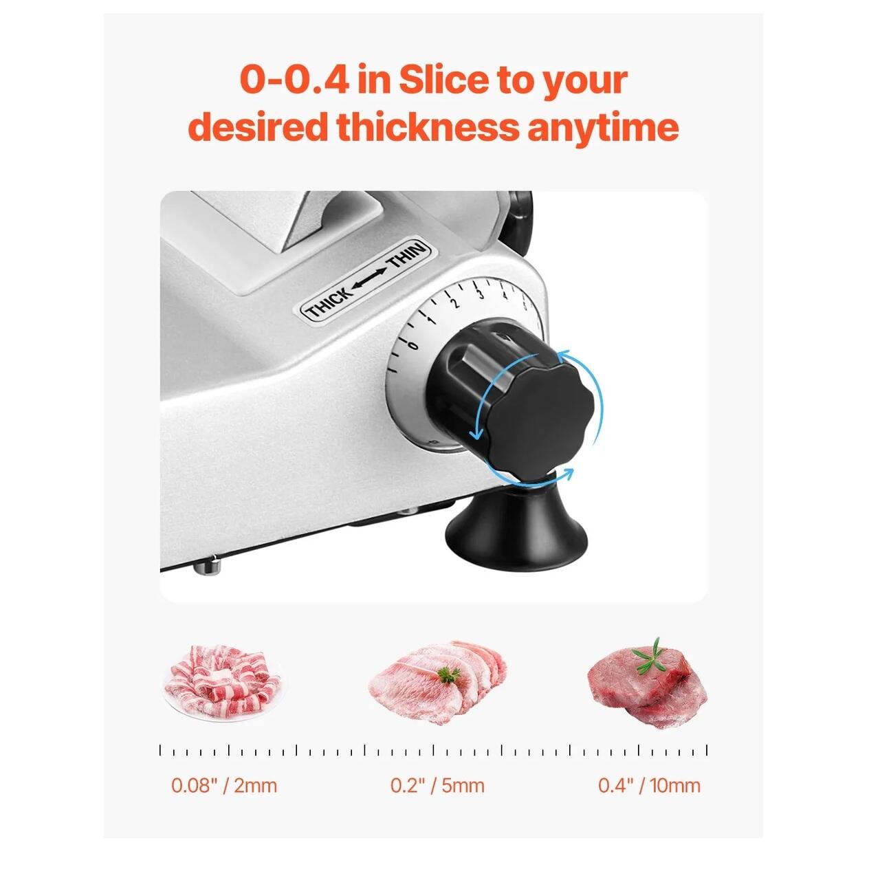 Grosime reglabila: Feliatorul de mezeluri dispune de un buton de reglare a grosimii cu un interval de la 0 la 10 mm. Puteti personaliza cu usurinta grosimea pentru a satisface nevoile dumneavoastra de preparare. Ideal pentru prepararea hamburgerilor, sandvisurilor, mezelurilor, platourilor cu fructe si multe altele.