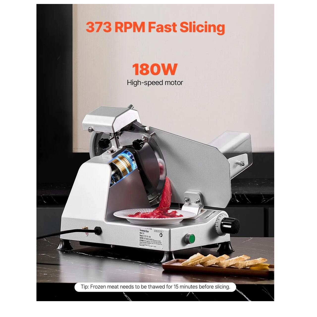 Feliere rapida: Alimentata de un motor de 180 W care functioneaza la 373 rpm, cuplata cu o lama ascutita, feliatorul nostru electric de carne va permite sa feliati rapid o varietate de ingrediente, sporind semnificativ eficienta muncii.