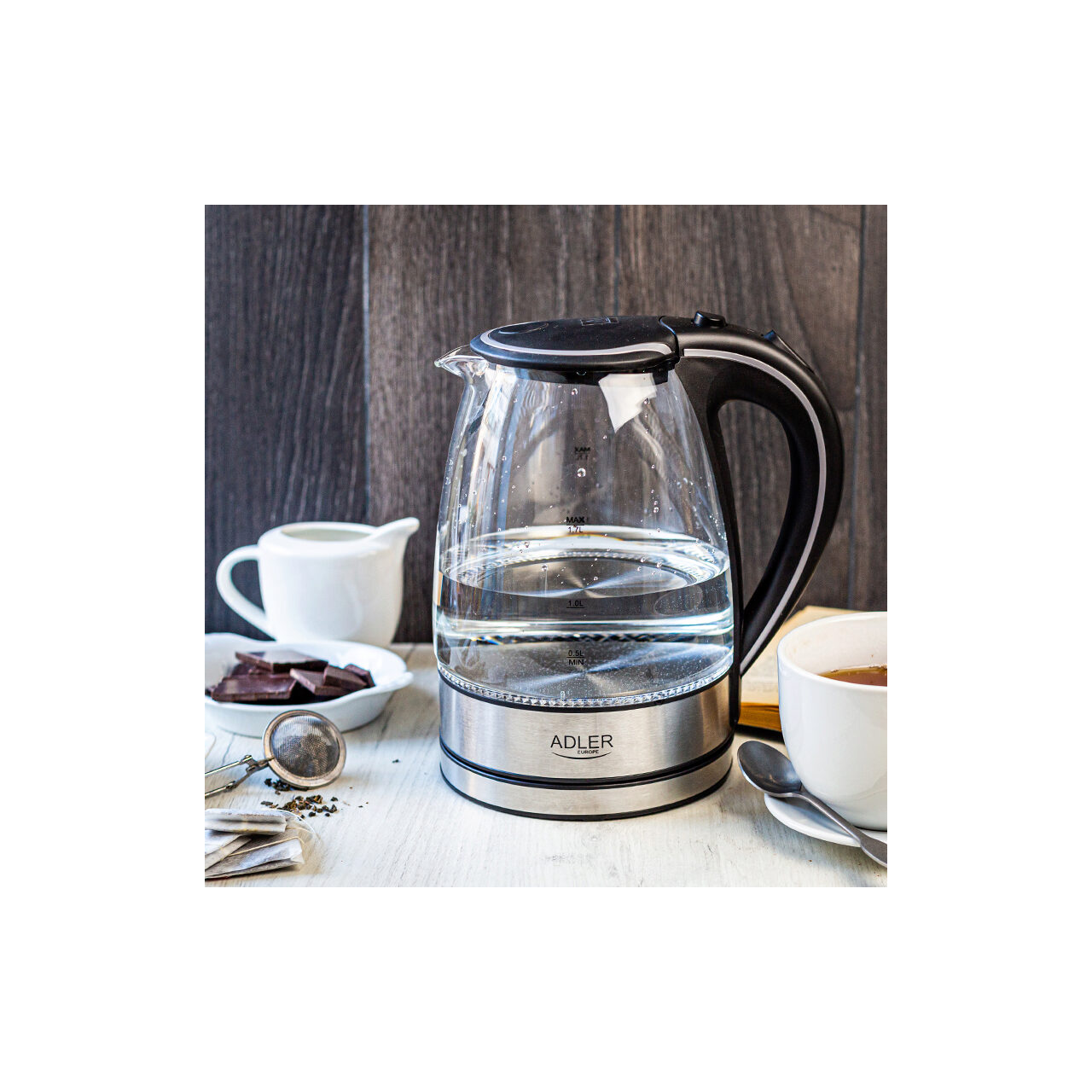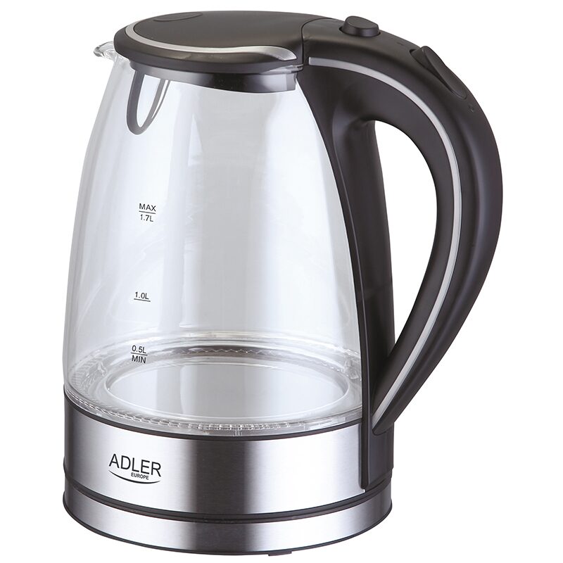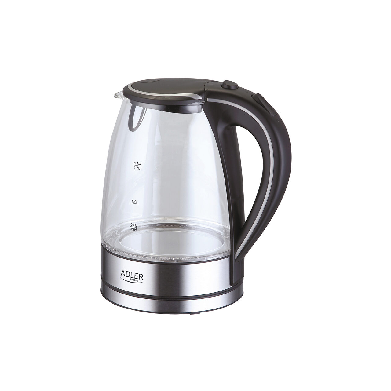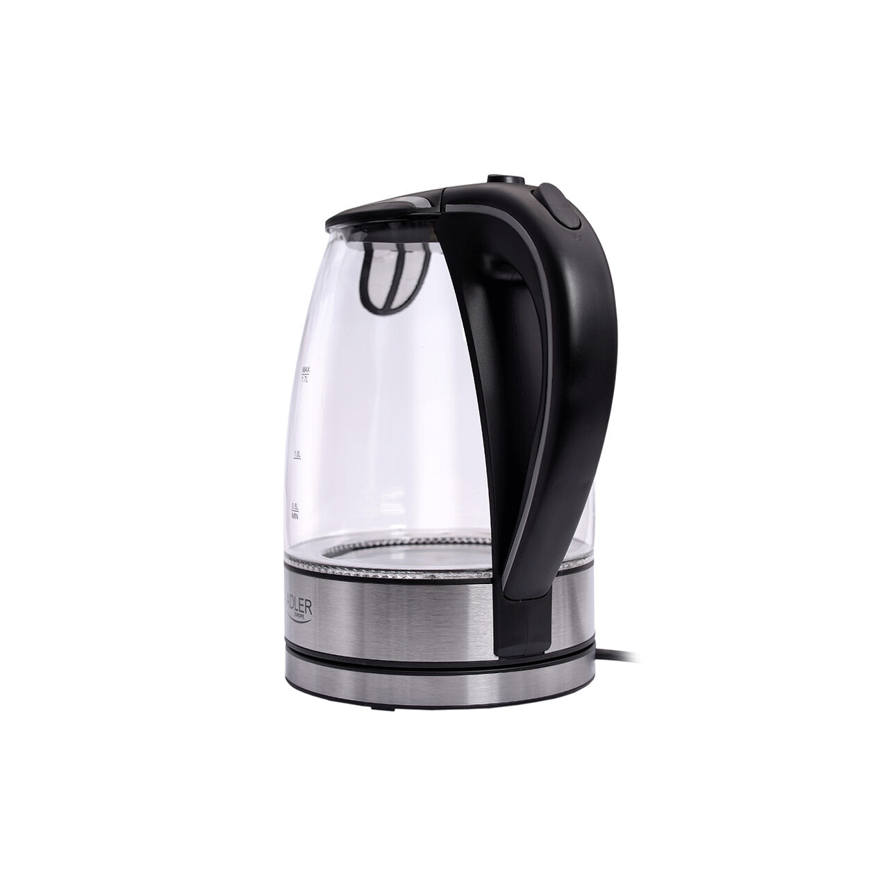 Fierbator electric cordless, Inox si Sticla, Capacitate 1.7 l, putere 2200 W, cana gradata, 24 x 21 x 16 cm