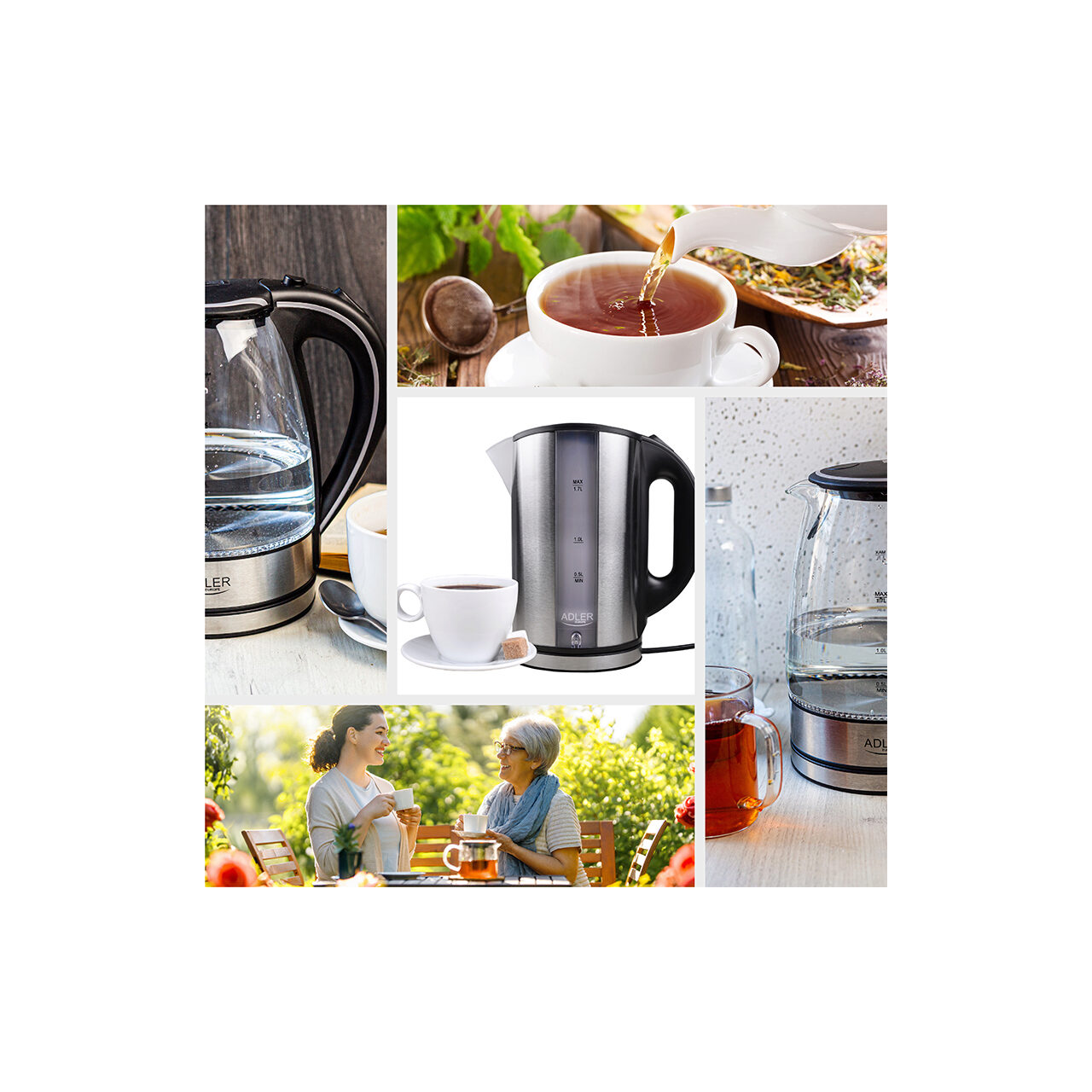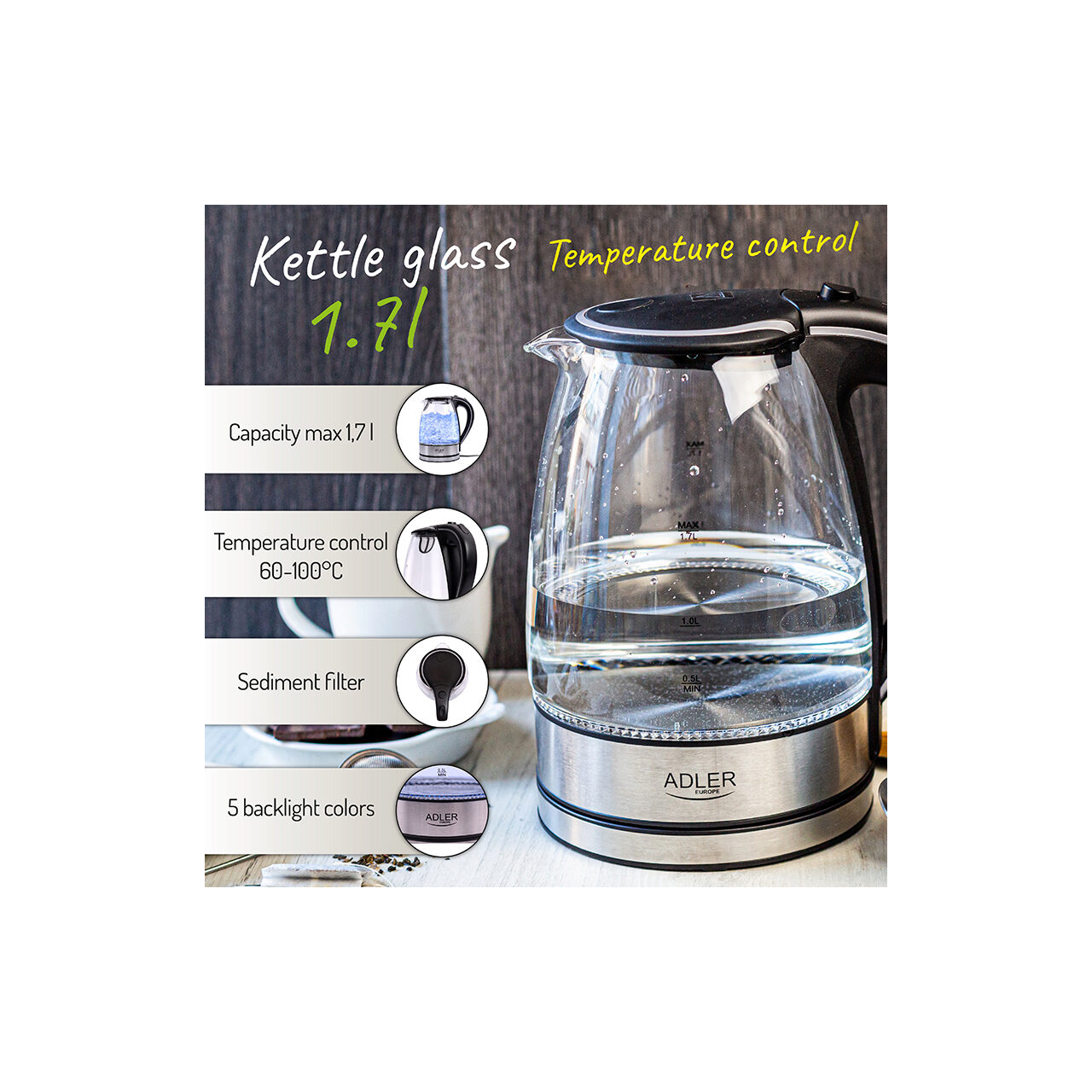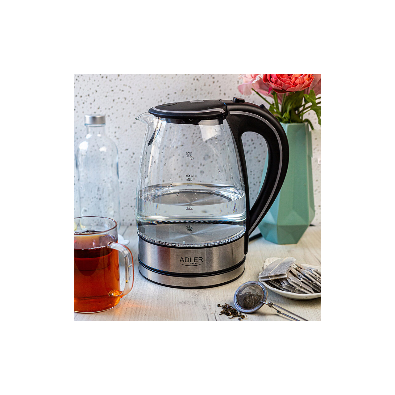 Fierbator electric cordless, Inox si Sticla, Capacitate 1.7 l, putere 2200 W, cana gradata, 24 x 21 x 16 cm