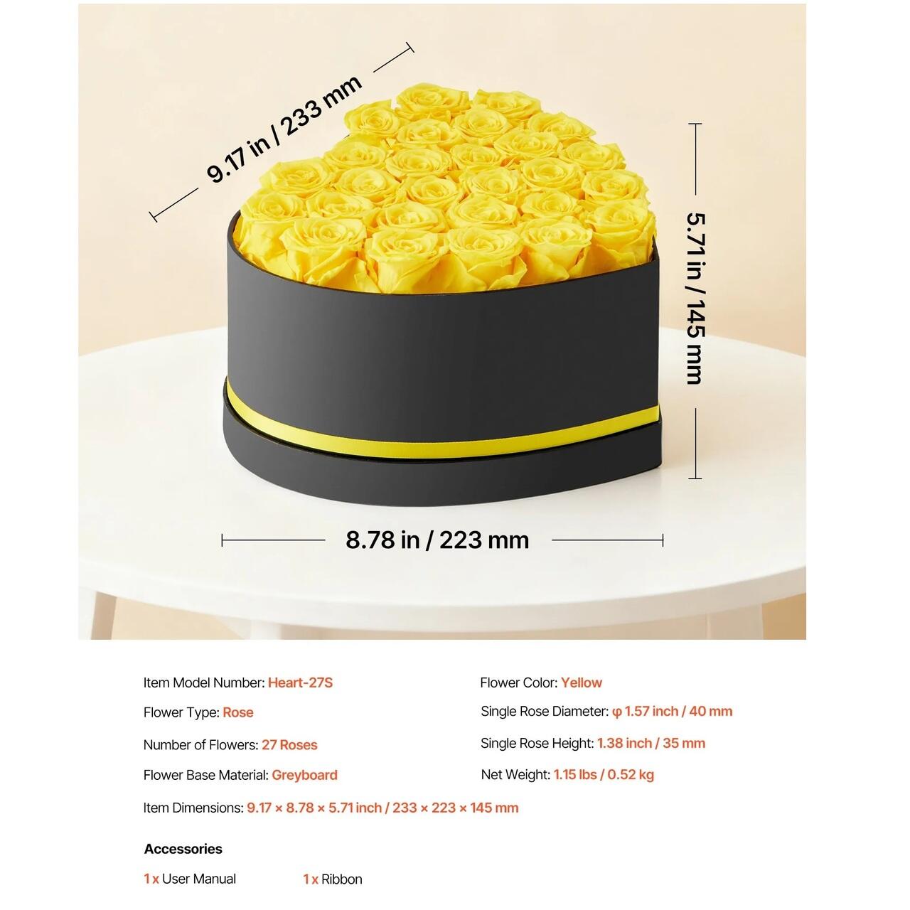 Cutie in forma de inima cu 27 trandafiri naturali conservati Forever Flowers, Galben, 224 x 231 x 145 mm