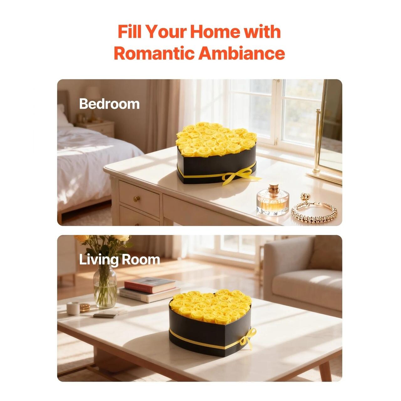 Flori conservate, fara ingrijire: Acesti trandafiri vesnici nu necesita udare sau lumina solara. Cu un parfum usor de trandafir, pur si simplu asezati-i oriunde pentru a va bucura de eleganta lor eterna, fara bataia de cap a intretinerii.