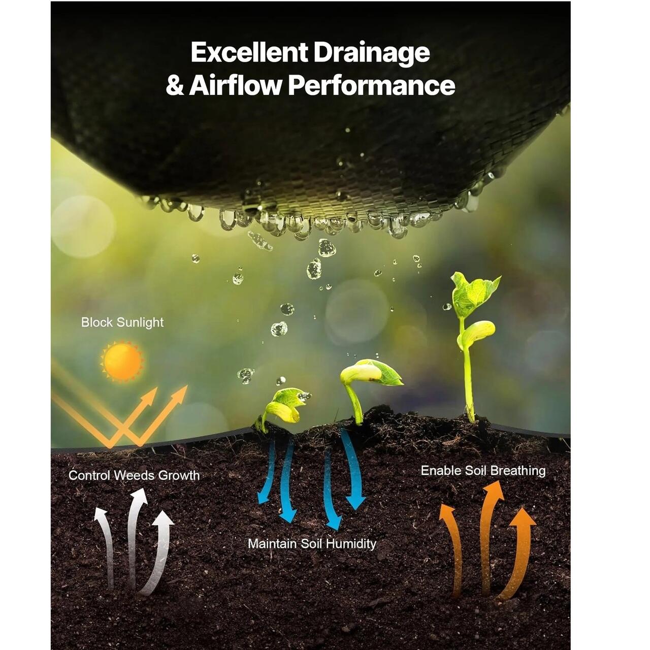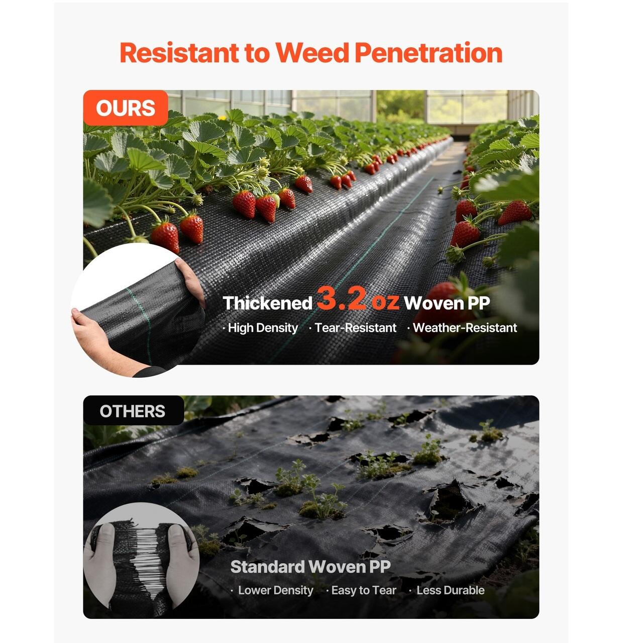 Control curat al buruienilor: Fabricata din material tesut PP de inalta densitate de 90,7 g, tesatura noastra de gradina blocheaza trecerea luminii solare si limiteaza cresterea buruienilor fara indepartarea manuala frecventa. Prin reducerea concurentei pentru apa si nutrienti, sustine plante mai sanatoase, mentinand in acelasi timp gradinile, straturile de plante si aleile curate.
