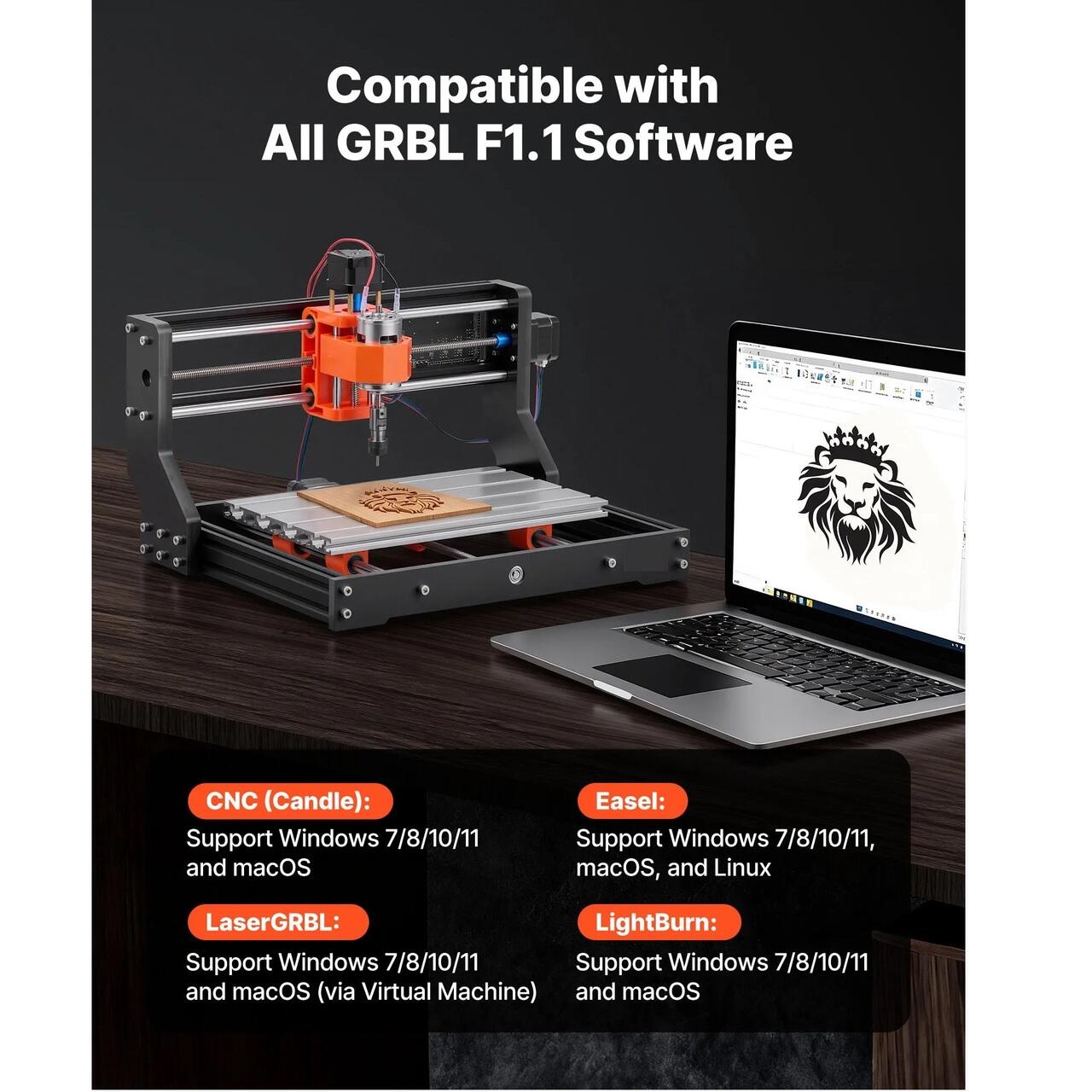 Compatibilitate software larga: Aceasta freza CNC pentru lemn este compatibila cu toate programele software care accepta firmware-ul GRBL f1.1. Include software-ul Candle pentru o configurare usoara. Functioneaza cu sisteme Mac/Windows/Linux si este compatibila cu CNC (Candle), Easel, LaserGRBL si LightBurn.
