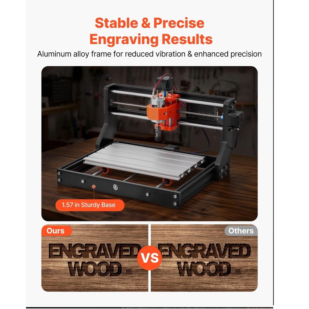 Gravura de inalta precizie: Masina de frezat CNC are un corp din aliaj de aluminiu si o baza robusta de 4 cm pentru stabilitate si vibratii reduse. Axul de 60 W si placa de control pe 32 de biti ofera o precizie de pozitionare repetata ≤0,07 mm.