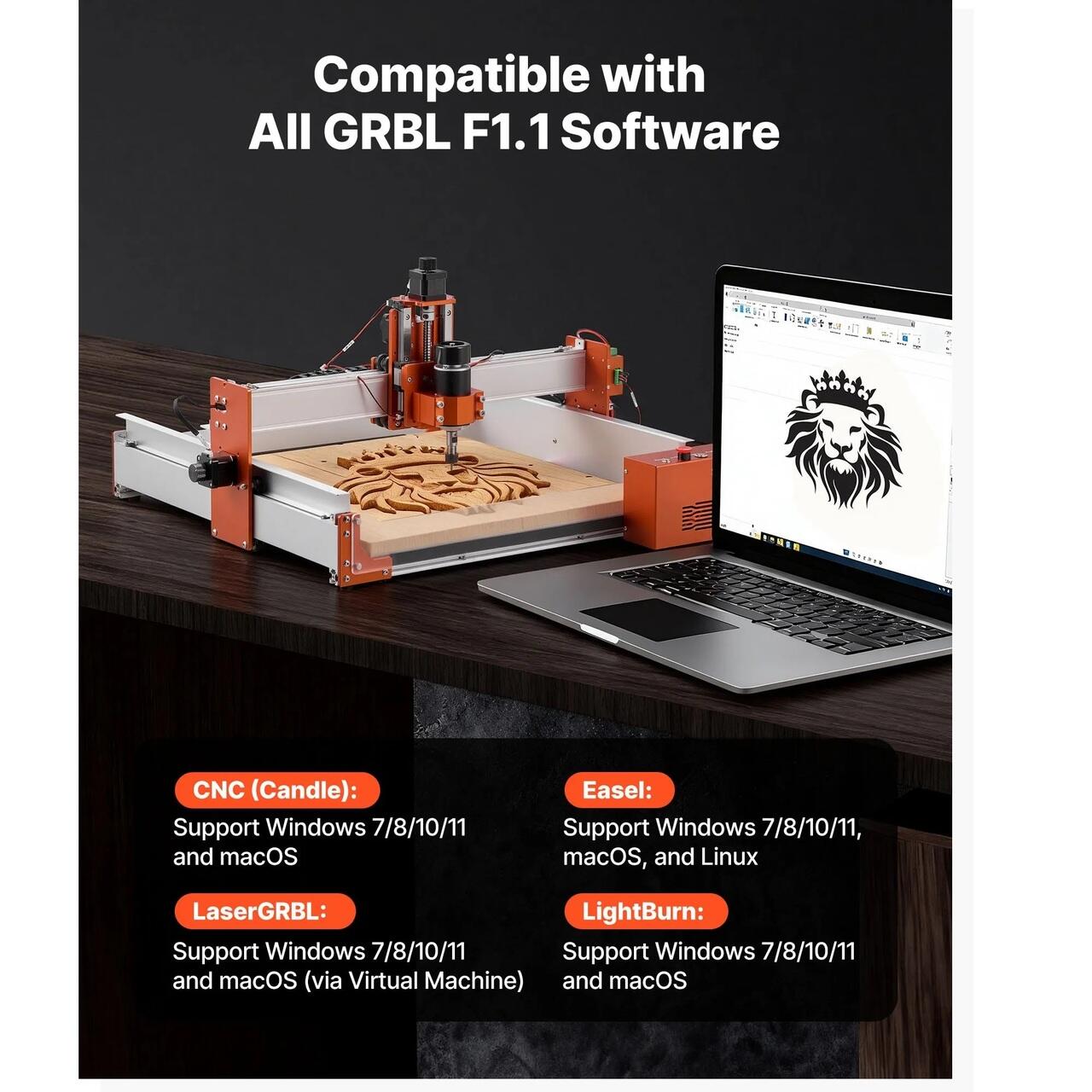 Compatibilitate software larga: Aceasta freza CNC pentru lemn este compatibila cu toate programele software care accepta firmware-ul GRBL f1.1. Include software-ul Candle pentru o configurare usoara. Functioneaza cu sisteme Mac/Windows/Linux si este compatibila cu CNC (Candle), Easel, LaserGRBL si LightBurn.