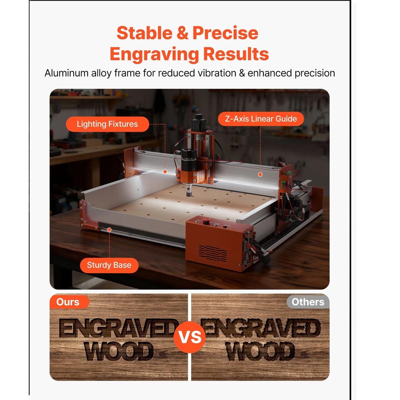 Gravura de inalta precizie: Masina de frezat CNC dispune de un cadru din aliaj de aluminiu, o sina liniara pe axa Z, un motor cu ax de 100 W si o placa de control pe 32 de biti, gravand cu usurinta lemn, acril, MDF, piele, metale moi etc. Precizie de pozitionare repetata ≤ 0,05 mm