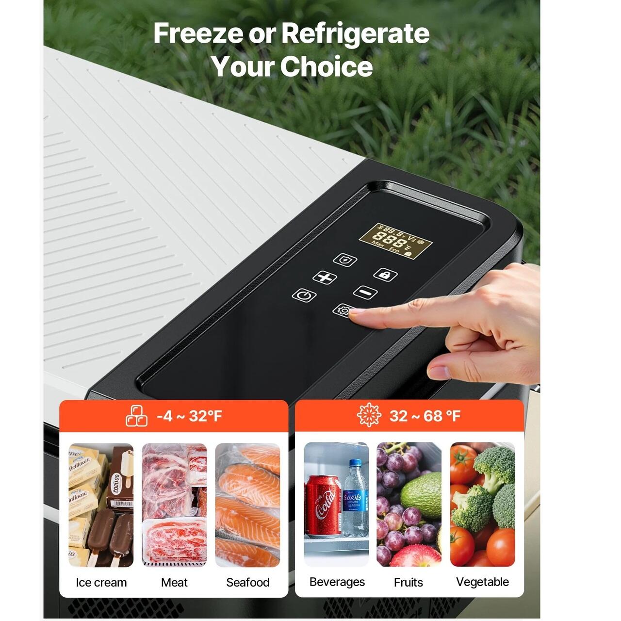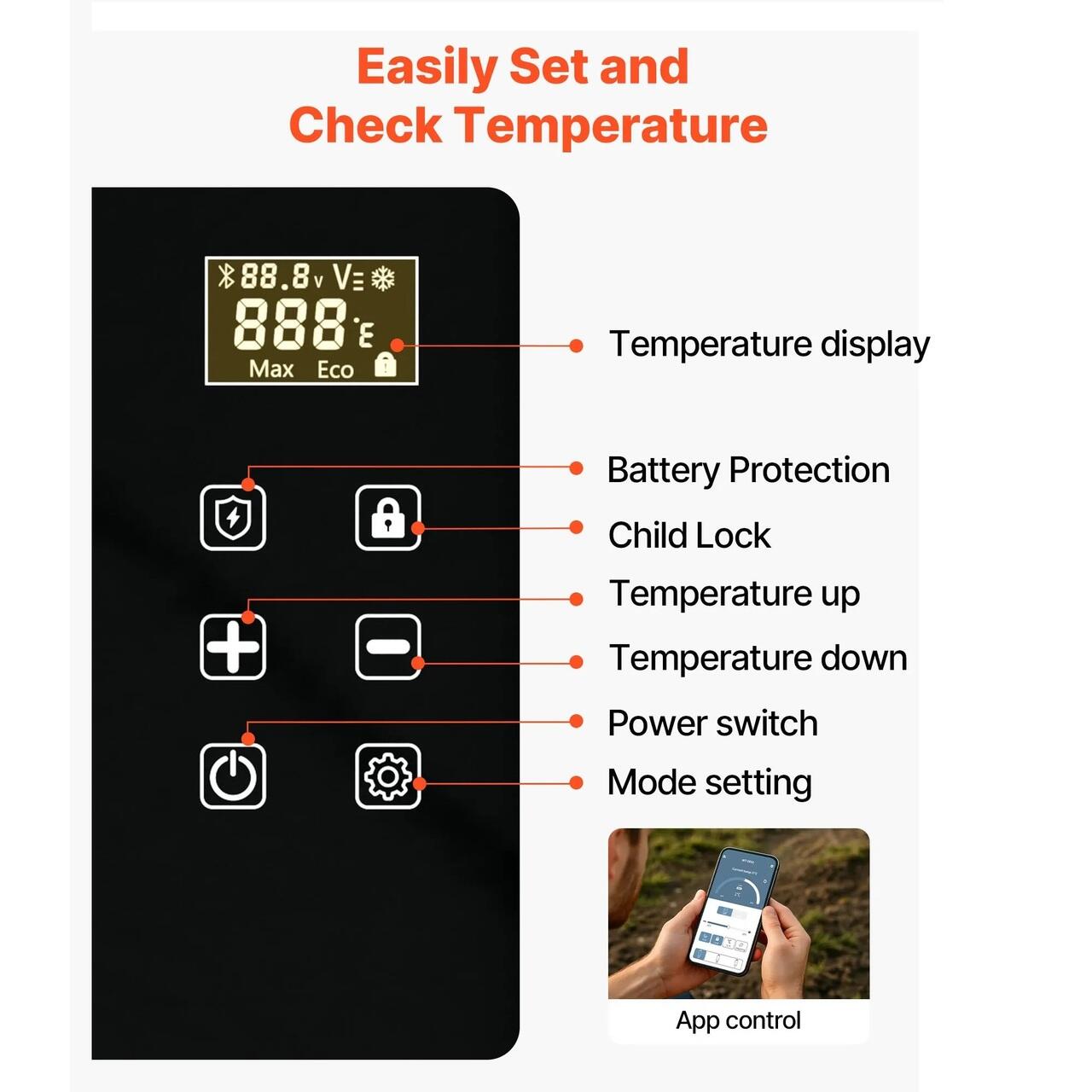 Control tactil precis: Cu un ecran tactil si o aplicatie, congelatorul nostru auto va permite sa reglati fin modurile si sa ajustati temperatura cu precizie. Temperatura interna poate fi vizualizata in orice moment, iar portul USB de sub afisaj adauga o incarcare convenabila a telefonului din mers.