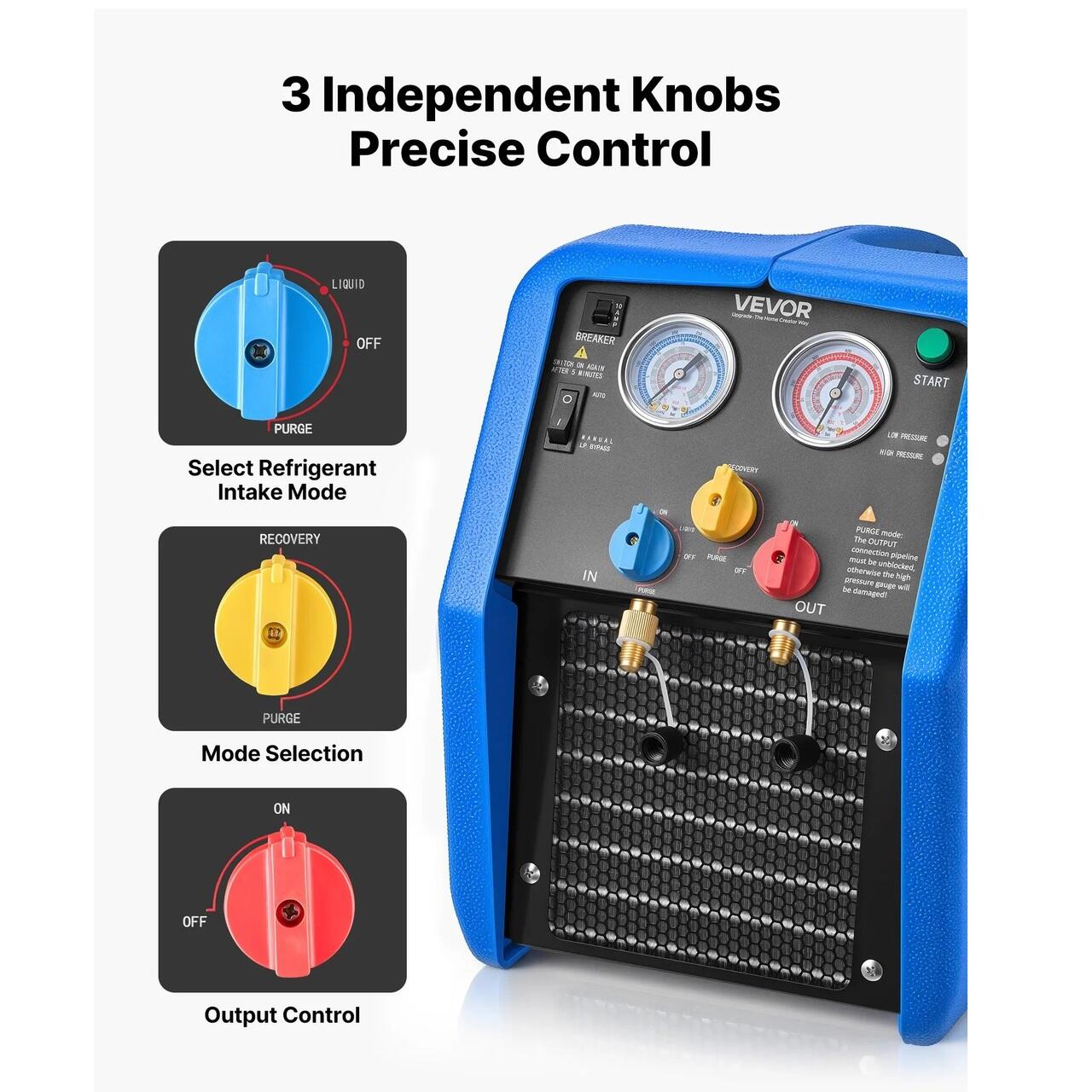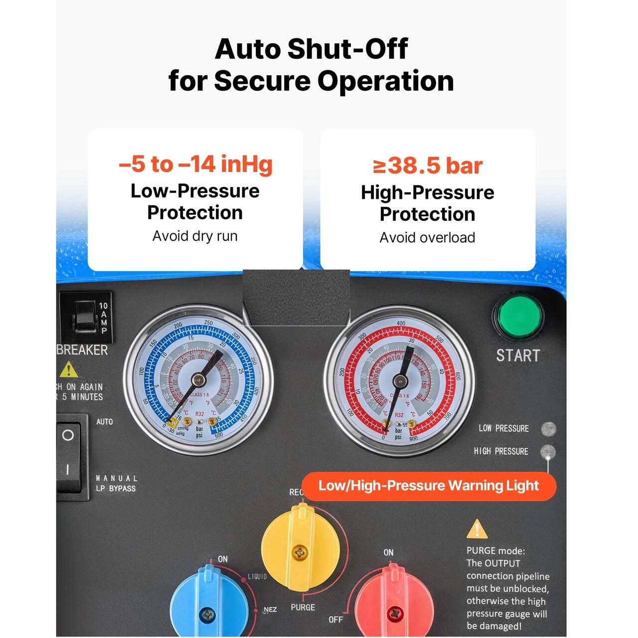 Design axat pe protectia pe primul loc: Masina de recuperare utilizeaza manometre de precizie pentru a monitoriza presiunea. Dispune de protectie la presiune ridicata (oprire automata la ≥38,5 bar) si joasa (–5 pana la –14 inHg), impreuna cu protectie la supracurent. Condensatorul si ventilatorul evita supraincalzirea.