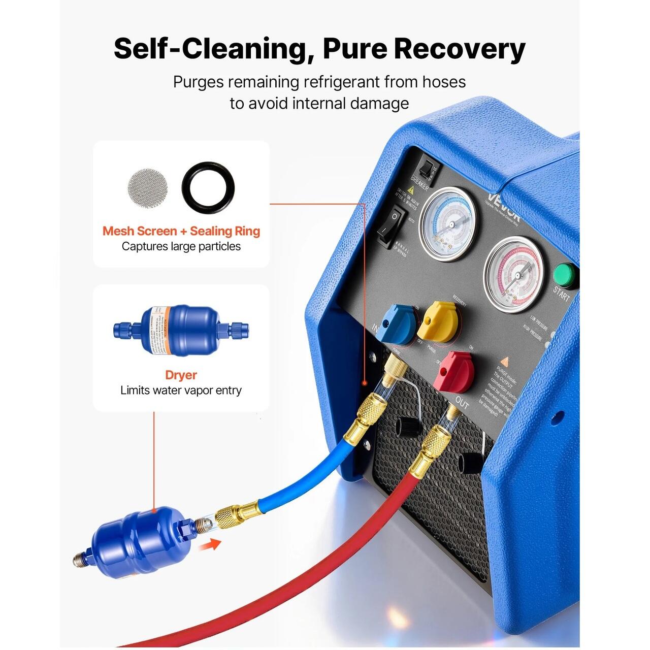 Filtru uscator: Cu un sistem de filtrare dubla, acest sistem de recuperare a agentului frigorific utilizeaza un filtru uscator si o plasa de filtrare pentru a extrage impuritatile si vaporii de apa din agentul frigorific. Prin recuperarea agentului frigorific intr-o stare curata si uscata, acesta protejeaza componentele interne.