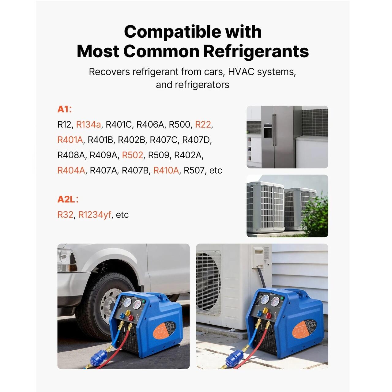 Compatibilitate larga: Aparatul nostru de recuperare a aerului conditionat functioneaza cu agenti frigorifici din clasa A1 (R12, R401A, R404A, R134a, R22, R407C, R407A, R407B, R410A, R507) si A2L (R32, R1234yf). Este ideal pentru sistemele HVAC rezidentiale si sistemele de aer conditionat auto.