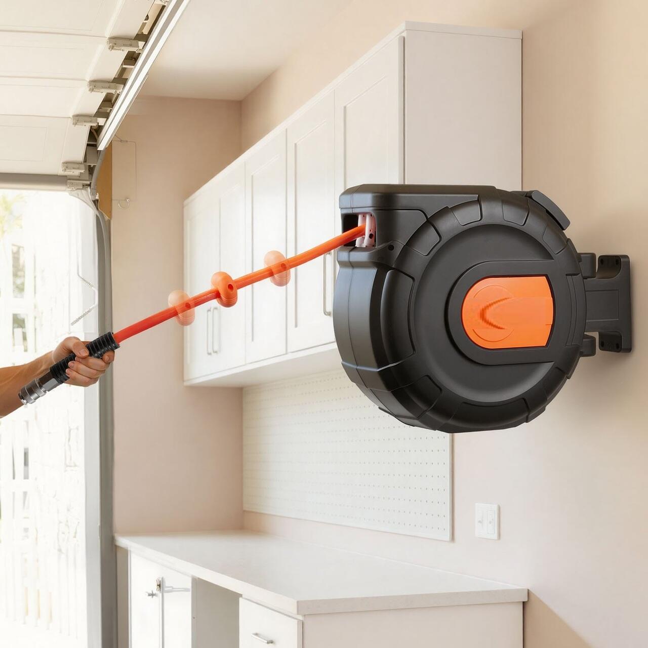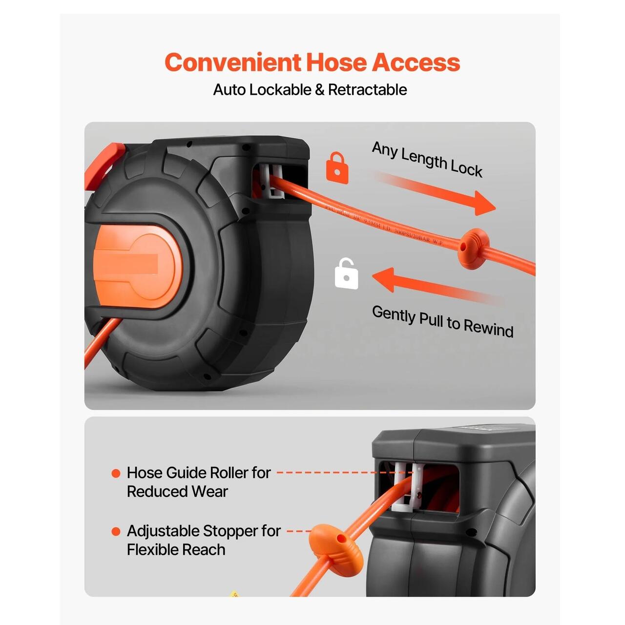 Reinfasurare automata: Gestionati furtunul cu usurinta cu sistemul de reinfasurare automata - trageti usor de el si se infasoara lin. Opritorul reglabil si blocarea sinei incorporata va permit sa fixati furtunul la orice lungime, iar rolele anti-agatare il ghideaza uniform pentru a reduce uzura.