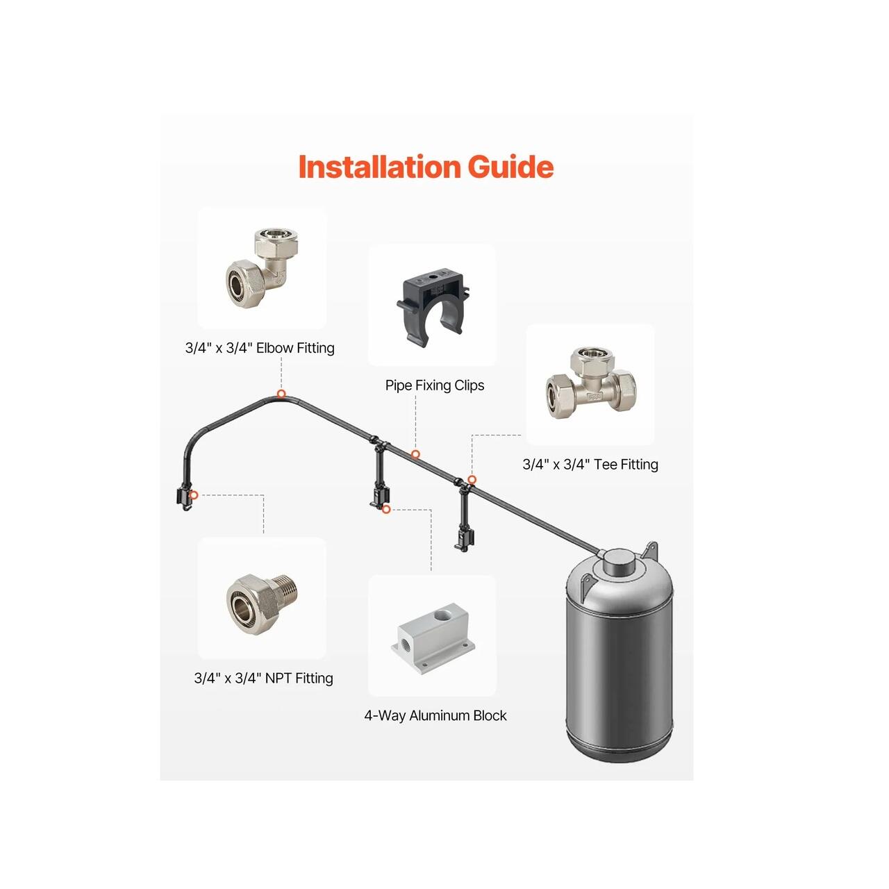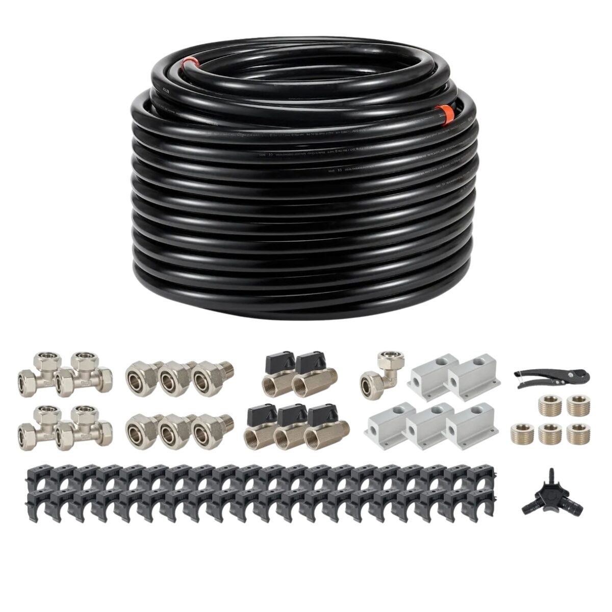 Pachet complet de accesorii: Acest kit de accesorii pentru sistemul de conducte de aer comprimat include tubulatura de 61 m x 1,8 cm (200 FT) x 1,8 cm (3/4"), 4 fitinguri in T, 1 racord cotat, 6 fitinguri NPT, 5 blocuri de aluminiu cu patru cai, 5 valve de alama, 5 dopuri de alama, 40 de cleme pentru tubulatura, impreuna cu un taietor de tubulatura si o unealta de taiat conic. Cu toate componentele incluse, va ajuta sa construiti eficient un sistem de alimentare cu aer stabil si fiabil.