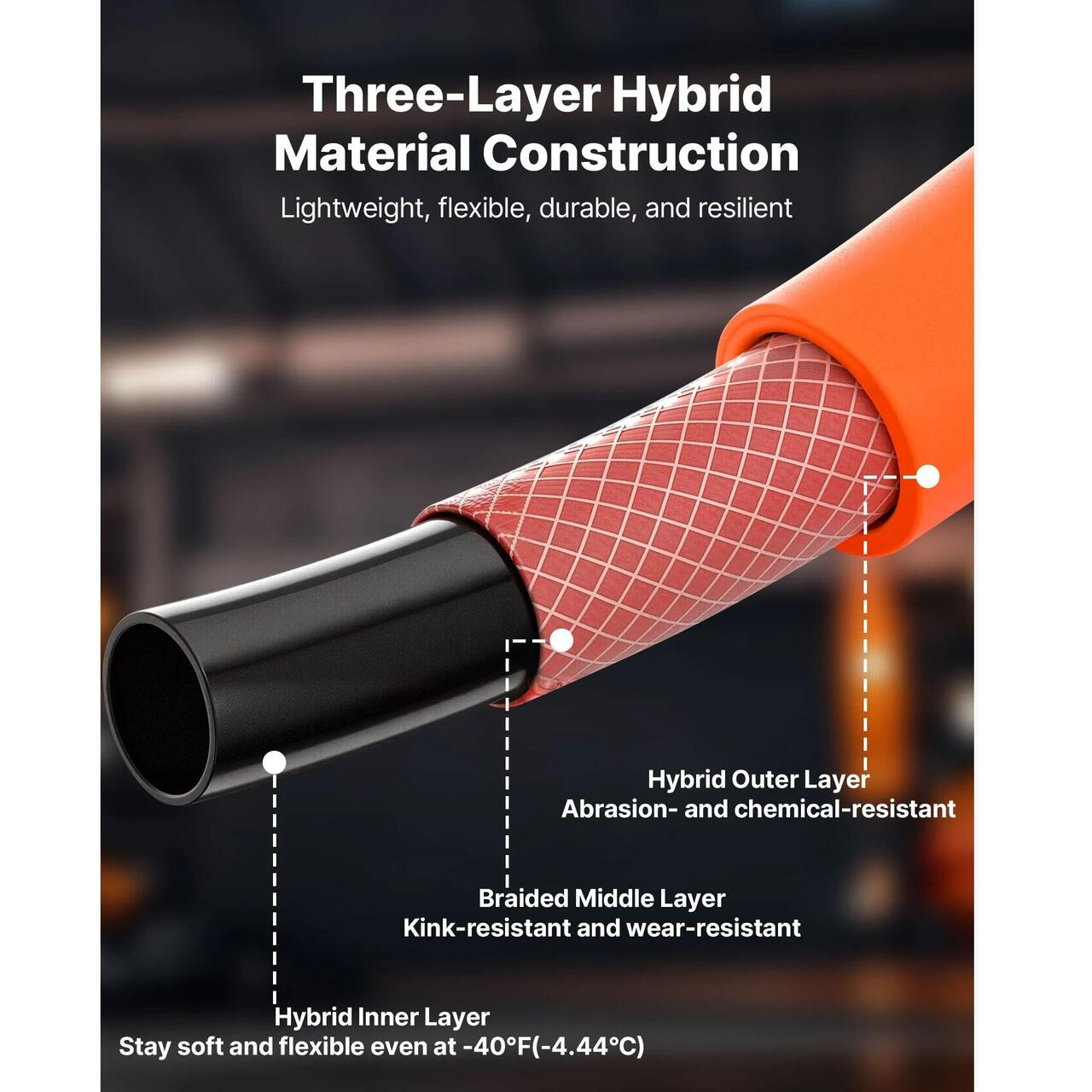 Material hibrid: Furtunul de aer este fabricat dintr-un hibrid cu trei straturi si combina un strat interior din polimer neted pentru circulatia aerului, o impletitura de poliester pentru rezistenta si un strat exterior din PVC-cauciuc pentru flexibilitate. Poate suporta o presiune de functionare de 300 PSI si o presiune de spargere de pana la 900 PSI.