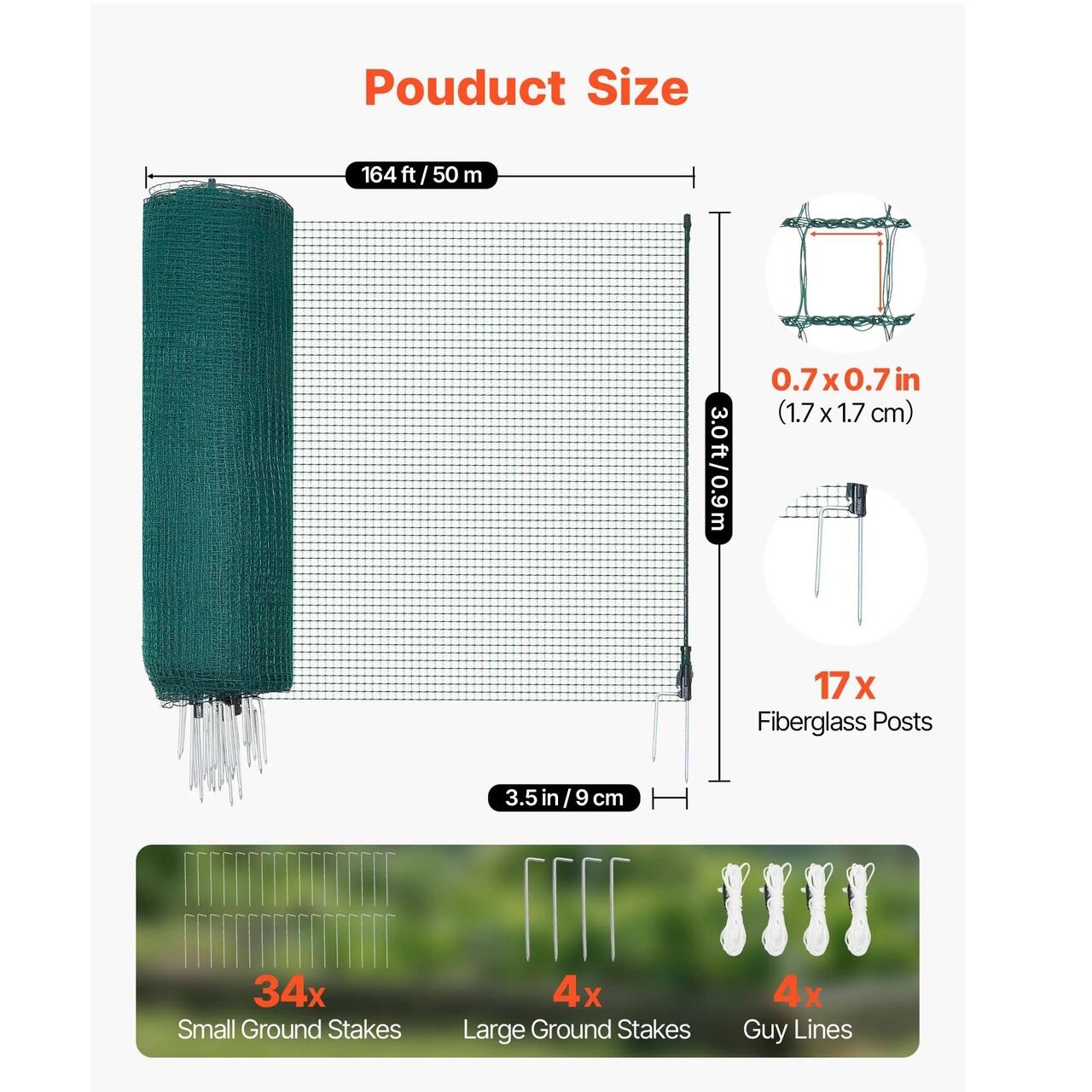 Tarc temporar mobil pentru Pasari/Animale mici, 0.9 x 50 m, Verde, 17 x Stalpi sustinere din fibra de sticla, 4 x cabluri ancorare