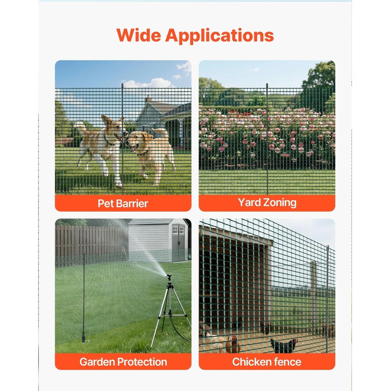 Multifunctional: Acest gard temporar din plastic este ideal pentru protectia gradinii, separarea zonelor pentru animale de companie, garduri pentru gaini, acoperirea straturilor de flori sau sectionarea anumitor zone. Se poate repozitiona sau ajusta cu usurinta pentru a se potrivi amenajarii exterioare (nu este recomandat pentru animalele de companie hiperactive).