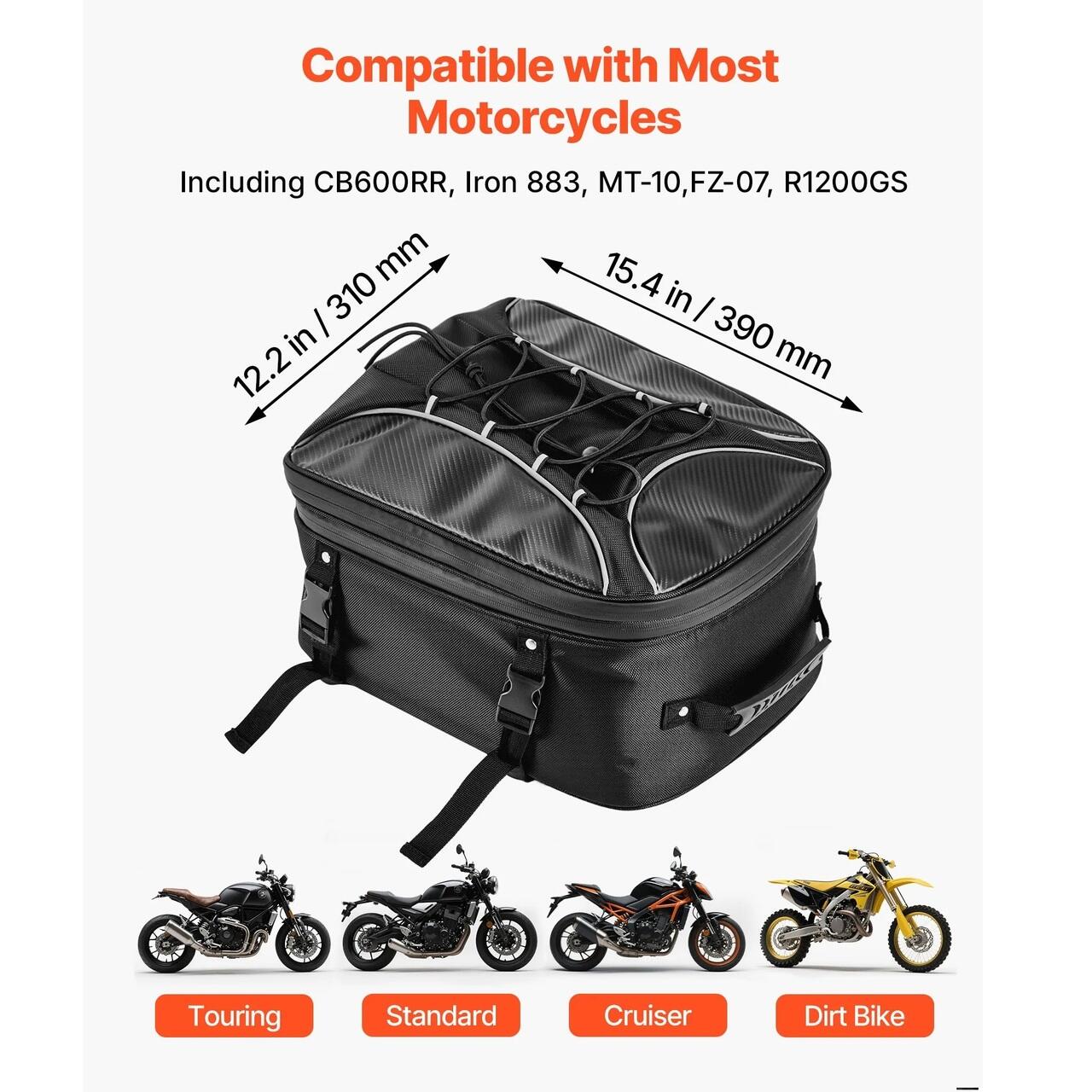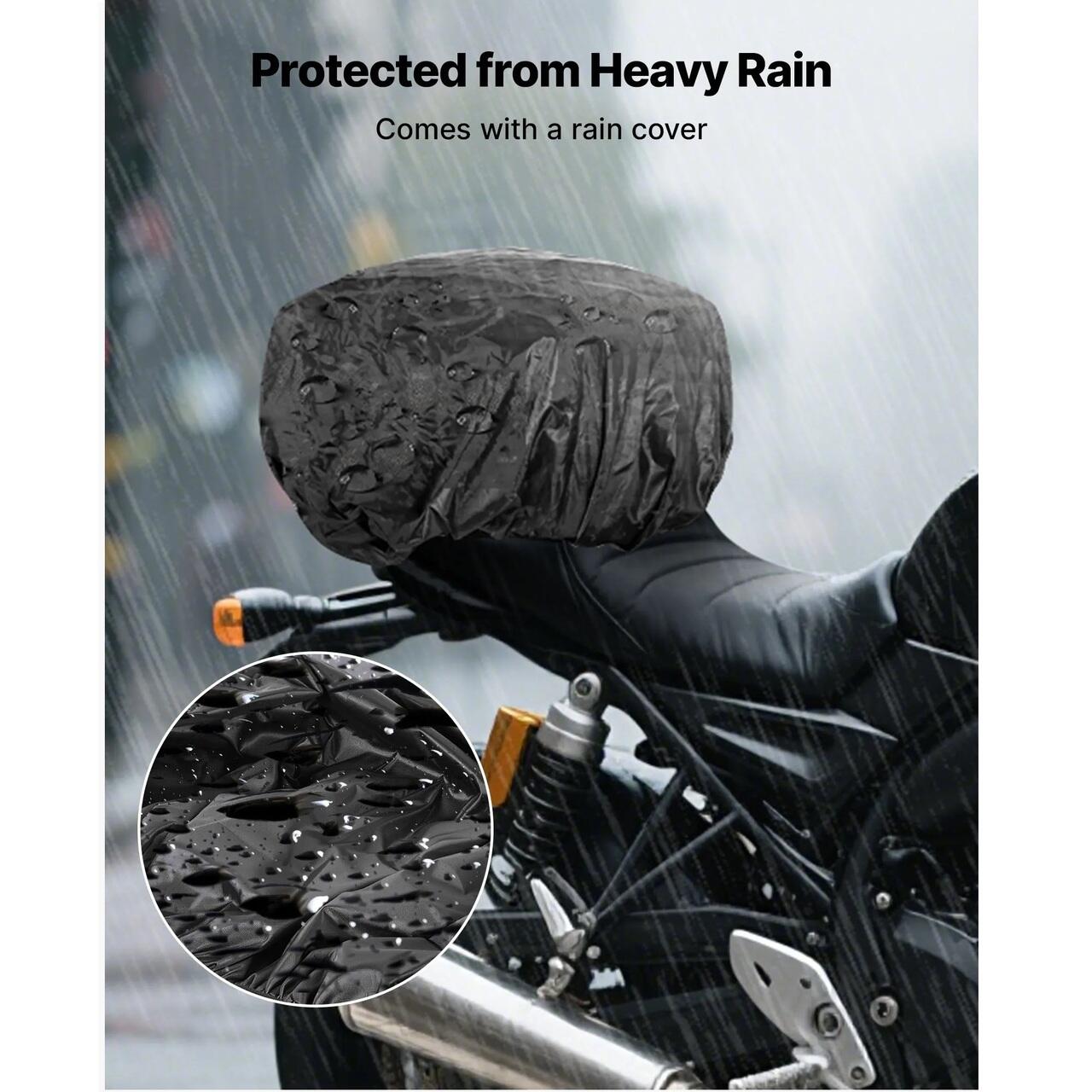 Capacitate mare 22-34 L: geanta pentru bancheta spate a motocicletei, cu o lungime de 39 cm si o latime de 31 cm, se extinde de la 20 cm la 29 cm inaltime. Poate tine cu usurinta o casca, o jacheta de motocicleta, echipament de ploaie, alimente si unelte de reparatii. Buzunarul din plasa depoziteaza electronice si documente.