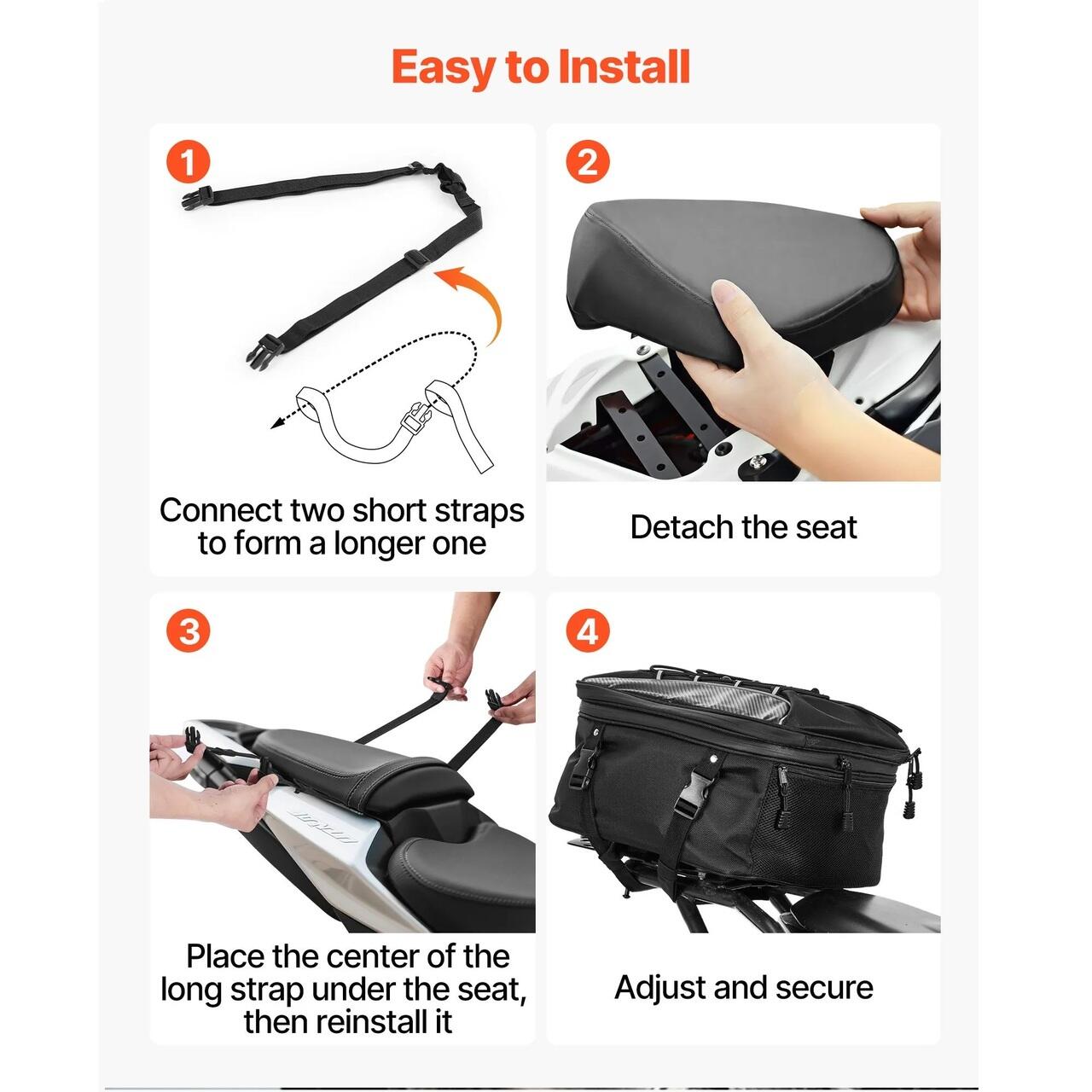 Compatibil cu majoritatea motocicletelor: Aceasta geanta de spate pentru motocicleta este conceputa pentru a se potrivi majoritatii motocicletelor, inclusiv touring, standard, cruiser si motociclete de teren. Se instaleaza rapid folosind patru curele fixate sub bancheta din spate, oferind o fixare stabila si antiderapanta.