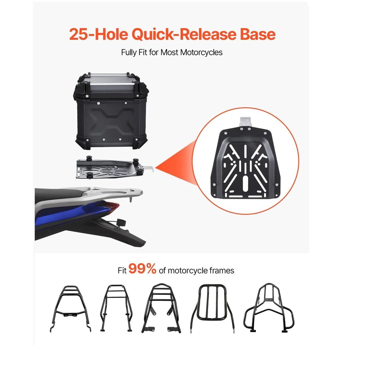 Versatil si compatibil: Partea inferioara a portbagajului are o baza cu 25 de gauri de montare, fiind compatibila cu o gama larga de motociclete, inclusiv modele Harley, Yamaha, Touring si motociclete standard. Pur si simplu aliniati baza cu portbagajul pentru o instalare usoara - nu este necesara gaurirea. Spuneti adio instalarii dificile!