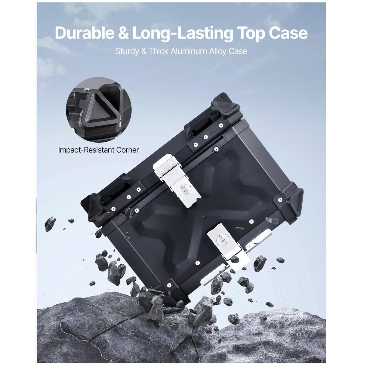 Carcasa premium rezistenta: Carcasa noastra de depozitare pentru motocicleta este construita robust, fabricata dintr-un aliaj de aluminiu cu grosimea de 1,2 mm, rezistent la uzura si caderi. Fiecare colt este intarit cu bare de protectie, ceea ce o face un companion potrivit pentru calatoriile dumneavoastra. In interiorul carcasei, captuseala detasabila din piele ofera amortizare pentru a va proteja bunurile, chiar si in cazul unor impacturi puternice.