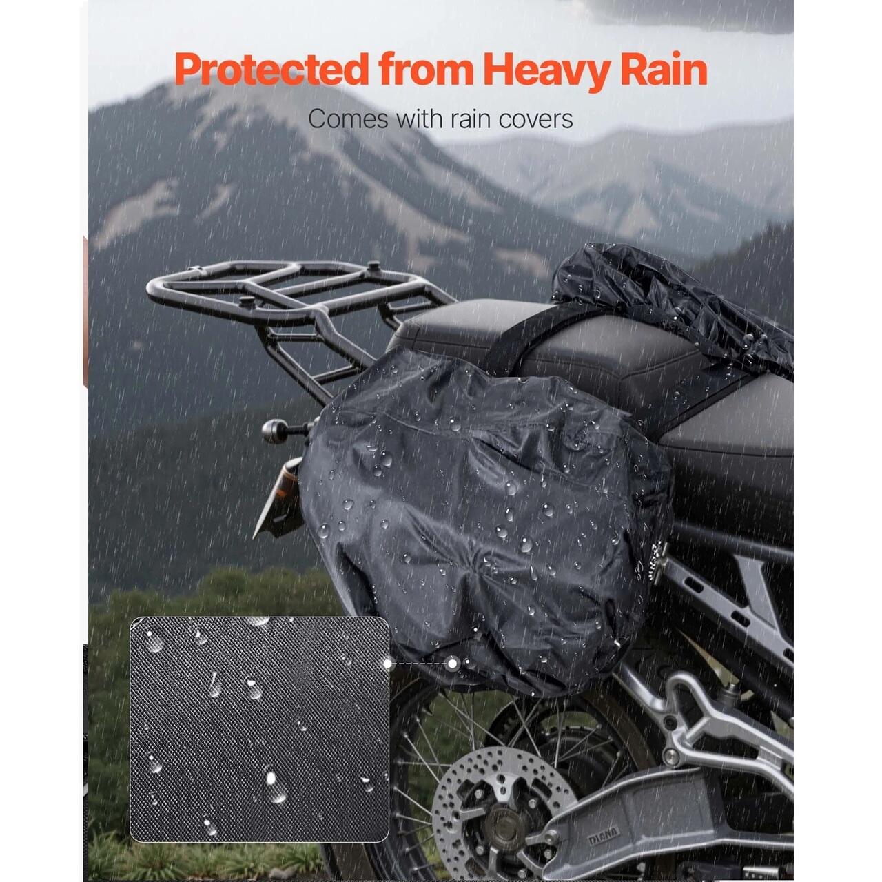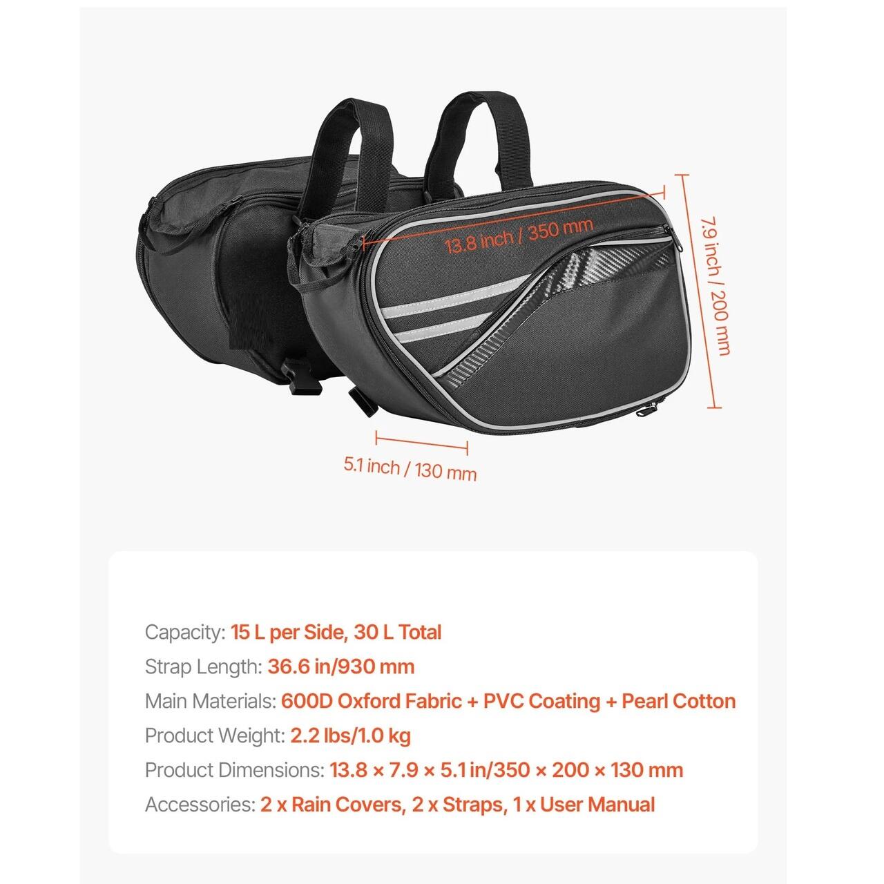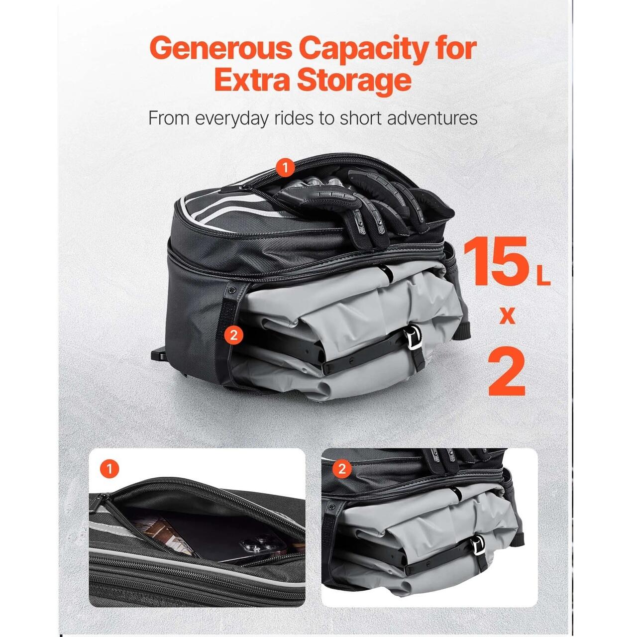 Capacitate mare de depozitare: Fiecare parte a gentii noastre laterale pentru motocicleta se extinde pana la 15 l, rezultand un total de 30 l. O singura geanta poate tine cu usurinta o jacheta de motocicleta, mancare, pelerina de ploaie si sticla. Mai multe compartimente interioare va organizeaza portofelul, documentele si cablurile de incarcare.